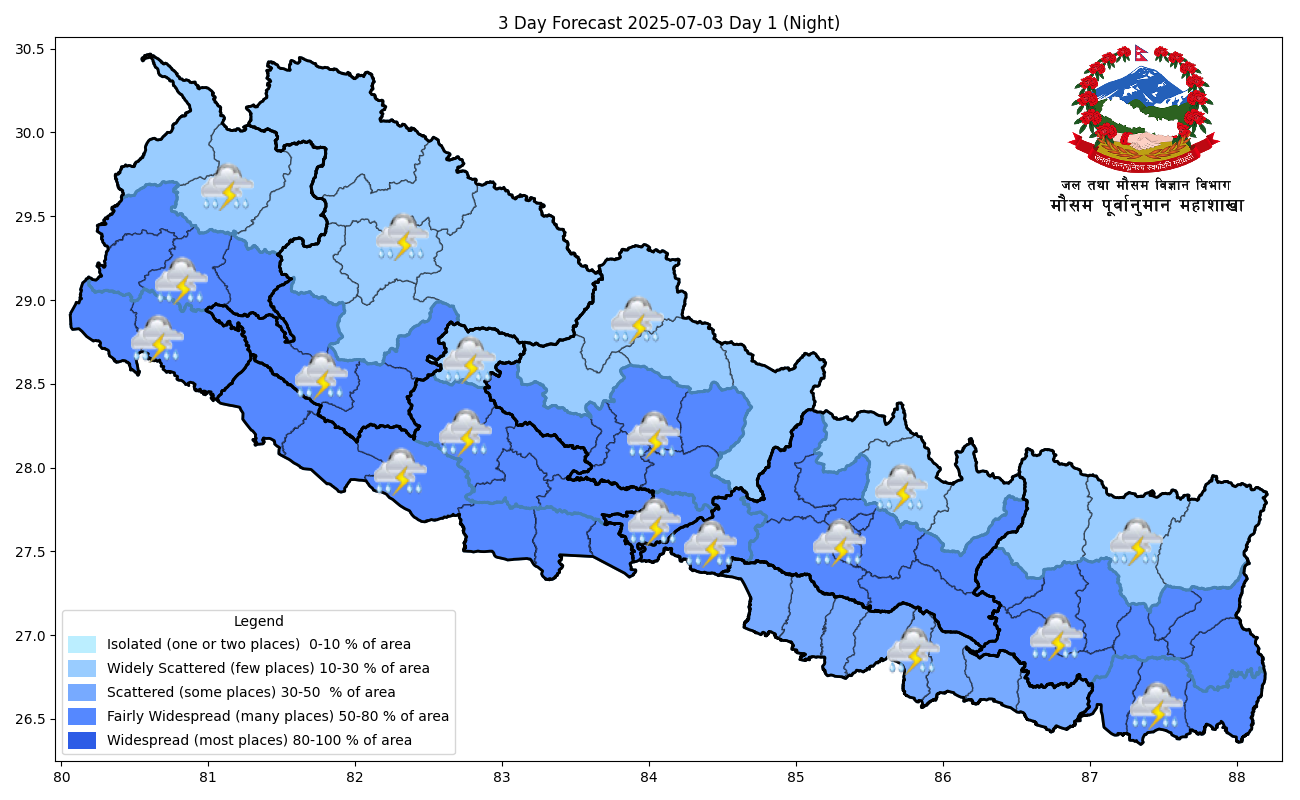 कोशी, वाग्मती, गण्डकी र लुम्बिनी प्रदेशका एकदुई स्थानमा भारी वर्षा हुने पूर्वानुमान