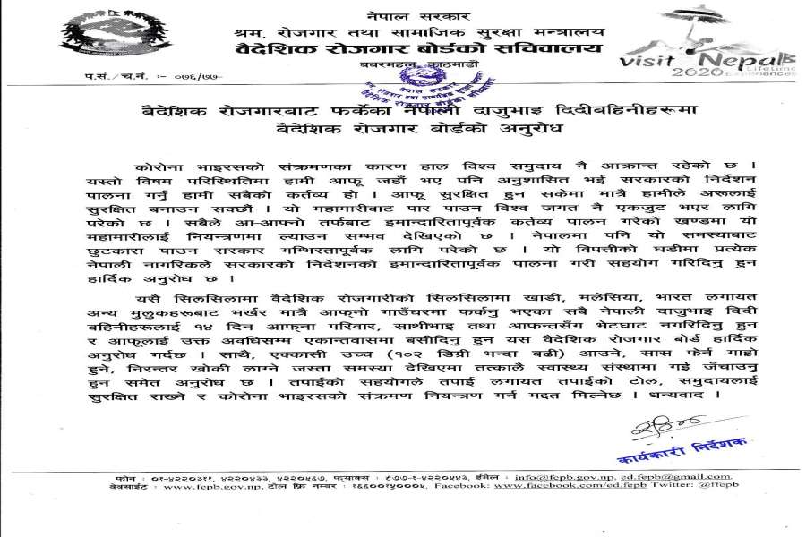 चैत्र १९, काठमाडौं । कतारले कोरोना भाइरसको संक्रमण नियन्त्रणका लागि क्वारेण्टाइनमा बस्नु परेका तथा आइसोलेसनमा राखिएका श्रमिकले पुरा तलव पाउने स्पष्ट गरेको छ । कतारको श्रम तथा सामाजिक मामिला मन्त्रालयले...