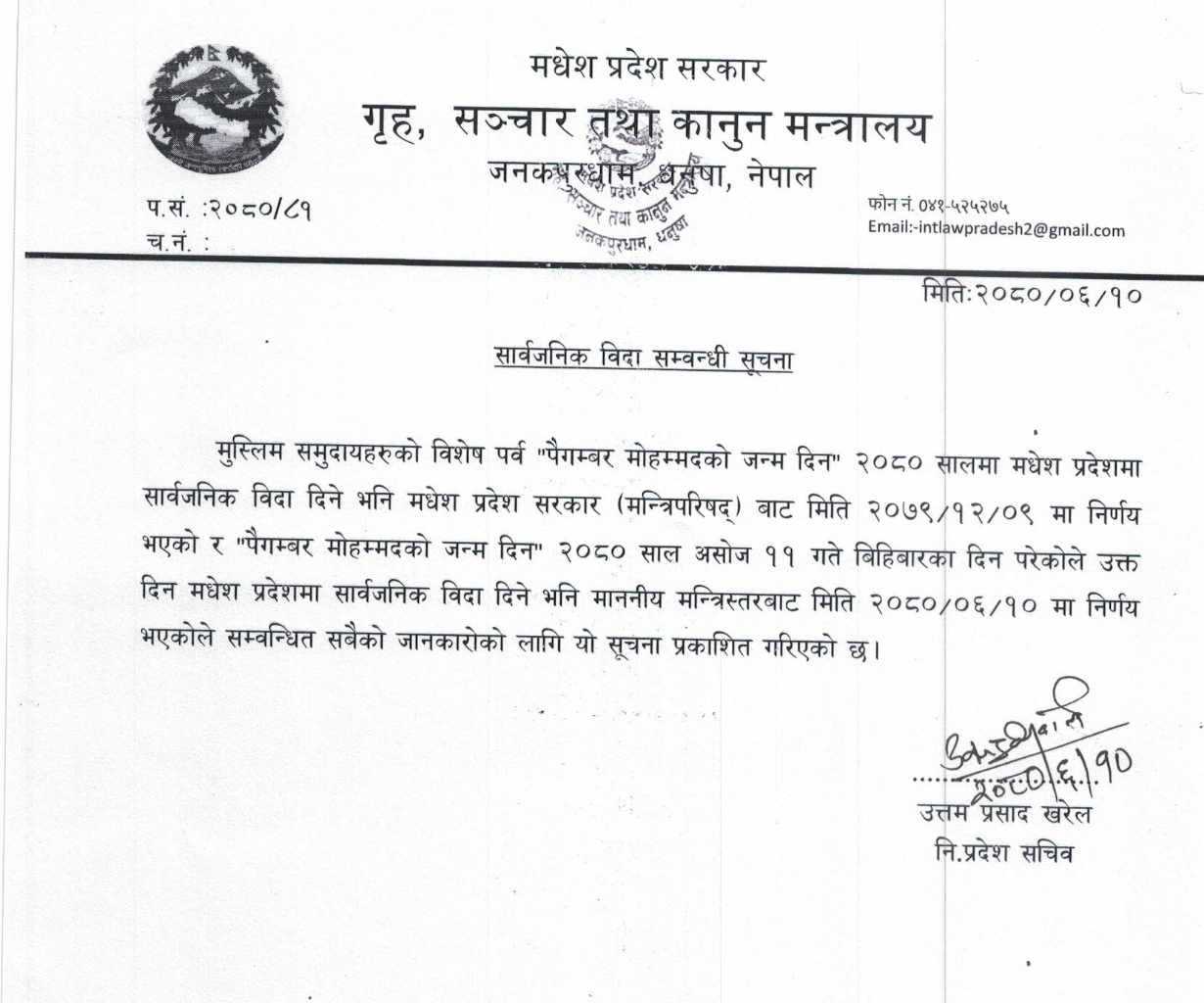 मधेस प्रदेश सरकारको गृह, सञ्चार तथा कानुन मन्त्रालयका निमित्त प्रदेश सचिव उत्तमप्रसाद खरेलले एक सूचना जारी गर्दै मुस्लिम समुदायको विशेष पर्व ‘पैगम्बर मोहम्मदको जन्म दिनको अवसरमा यही असोज ११ गते बिहीबार अर्थात भोली सार्वजनिक बिदा दिएको जानकारी दिएका छन् ।