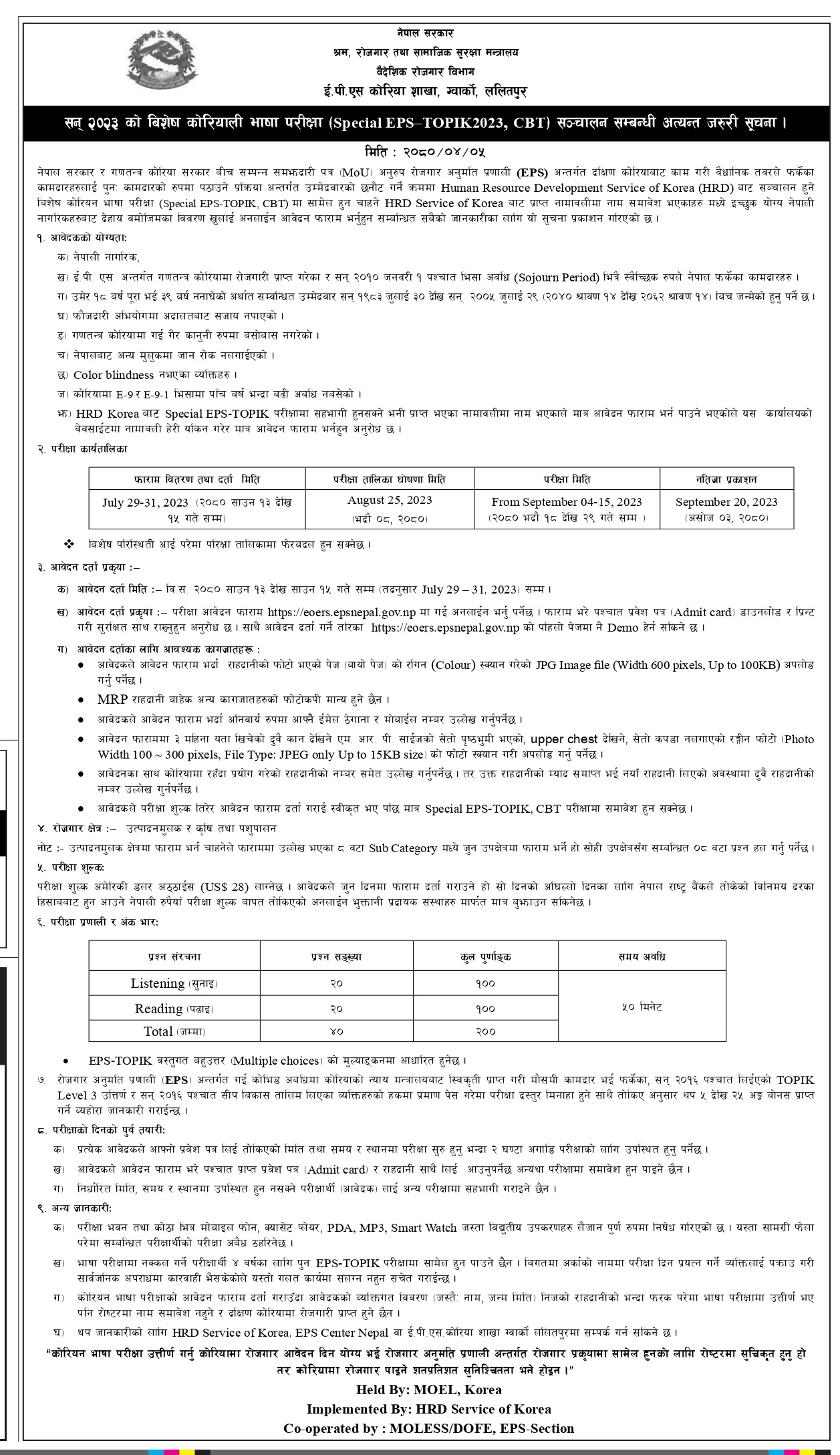 कोरियामा इ–९ र इ–९–१ भिसामा पाँच वर्ष भन्दा बढी अवधि नबसेका र कोरियाको मानव संशाधान विभाग बाट इपिएस भाषा परीक्षामा सहभागी हुन सक्ने भनेर नामावलीमा नाम भएकाले फारम भर्न पाउने पनि शाखाले जानकारी दिएको छ।