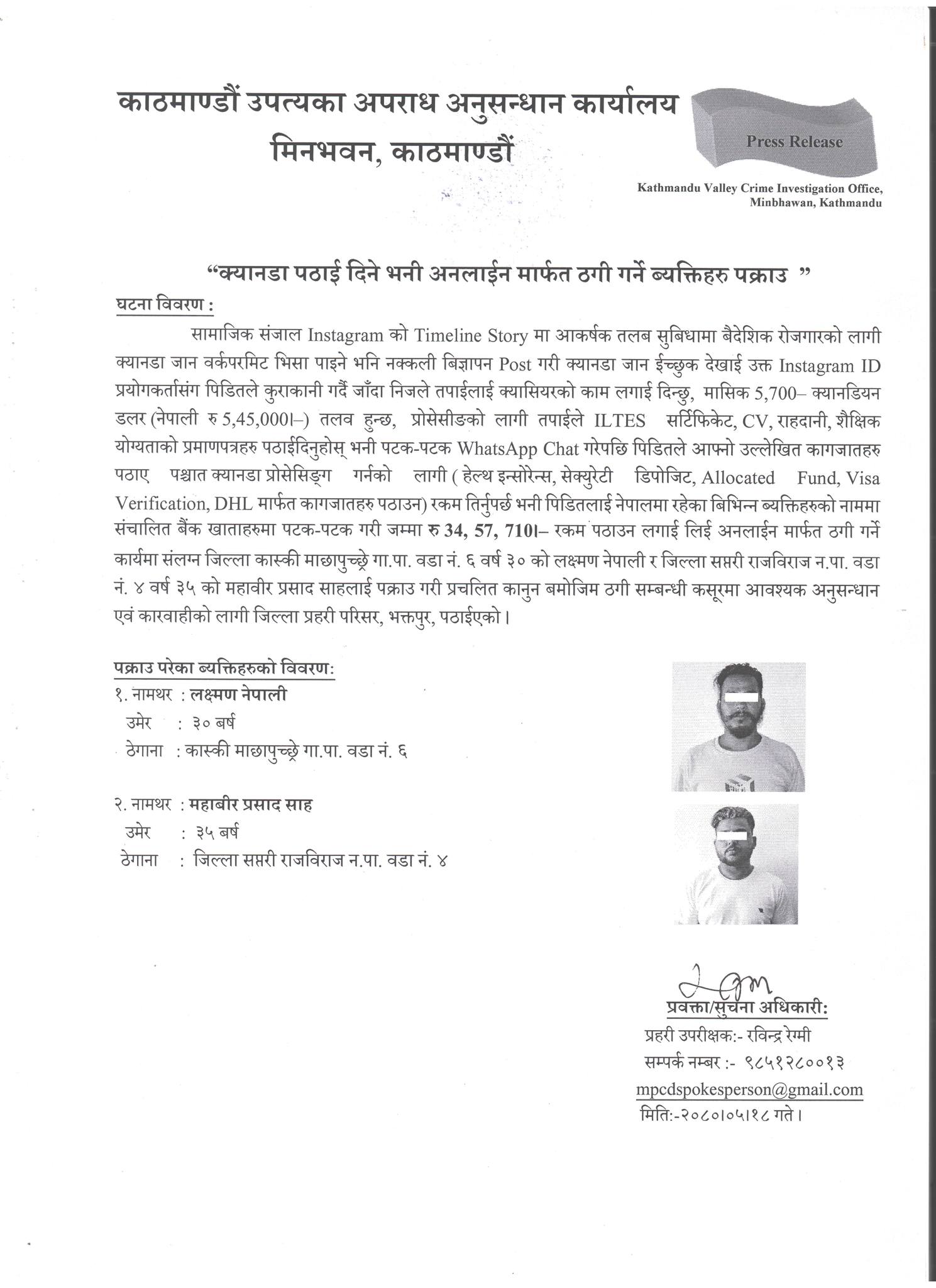 कार्यालका अनुसार इन्स्टाग्राममा आकर्षक तलब सुविधामा वैदेशिक रोजगारका लागि क्यानडा जान वर्कपर्मिट भिसा पाइने भनी नक्कली विज्ञापनमा फस्दा पीडितहरु ठूलो रकम गुमाउन पुगेका हुन् ।