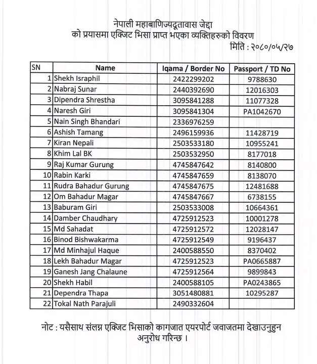 साउदी अरेबियाका विभिन्न कम्पनी कार्यरत रहँदा साउदी आवासीय अनुमति पत्र (इकामा) नबनाइएका वा नवीकरण नगरिएका नेपालीहरूलाई स्वदेश फर्काउन आवश्यक बहिर्गमन भिसाका लागि सम्बन्धित साउदी निकायमा अनुरोध गरिएको थियो ।