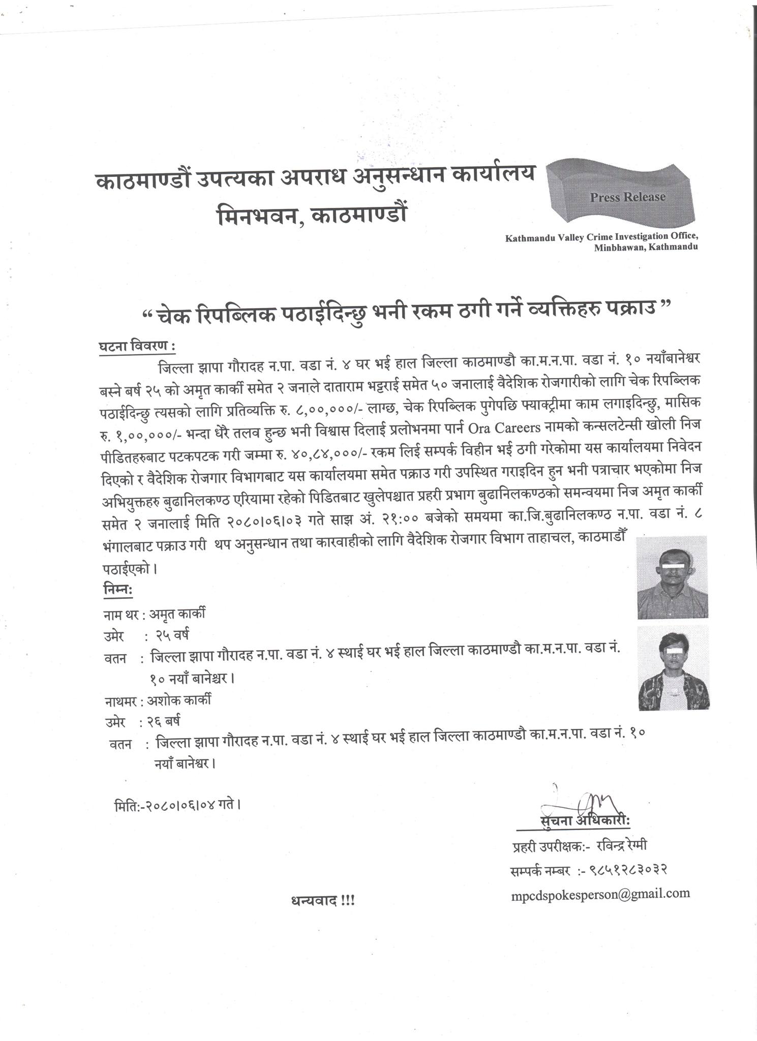 काठमाण्डौं उपत्यका अपराध अनुसन्धान कार्यालय मीनभवनले प्रहरी प्रभाग बुढानिलकण्ठको समन्वयमा बिहीबार झापा घर भइ नयाँबानेश्वर बस्ने अमृत कार्की र अशोक कार्कीलाई पक्राउ गरेको हो। उनीहरूविरुद्ध प्रतिव्यक्ति ८ लाखका दरले ४० लाख ८४ हजार रकम ठगेको उजुरी परेको थियो। उनीहरुले दाताराम भट्टराई समेत ५० जनालाई वैदेशिक रोजगारीको लागि चेक रिपब्लिक पठाईदिन्छु भनी रु. ४० लाख ८४ हजार रकम ठगी  गरेका थिए ।