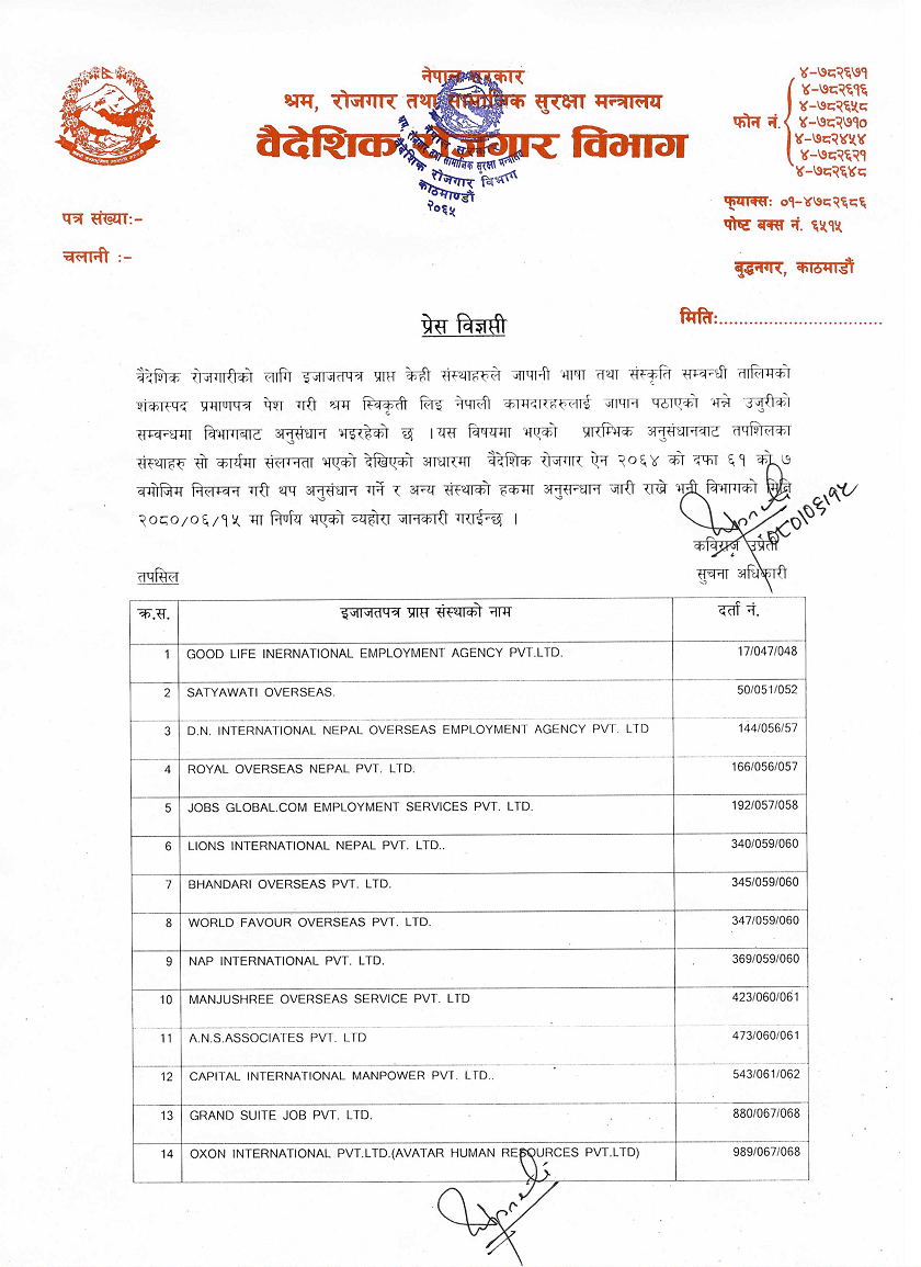 त्यसरी निलम्बनमा पर्नेहरूमा गुड लाइफ इन्टरनेशनल इम्प्लोमेन्ट एजेन्सी, सत्यवती ओभरसिज, डीएन इन्टरनेशनल, रोयल ओभरसिज, जब्स ग्लोबल, लायन्स इन्टरनेशनल लगायतका १४ वटा मेनपावर कम्पनी रहेका छन् ।