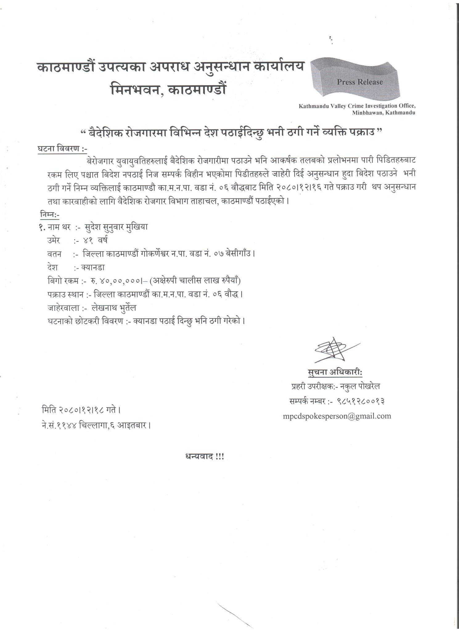 वैदेशिक रोजगारीको लागि सुनुवारले लेखनाथ भुर्तेलसमेतलाई क्यानडा पठाइदिने र त्यहाँ प्रतिष्ठित कम्पनीमा काम लगाइदिने आश्वासन दिएर ४० लाख रुपैयाँ ठगीगरेका थिए।