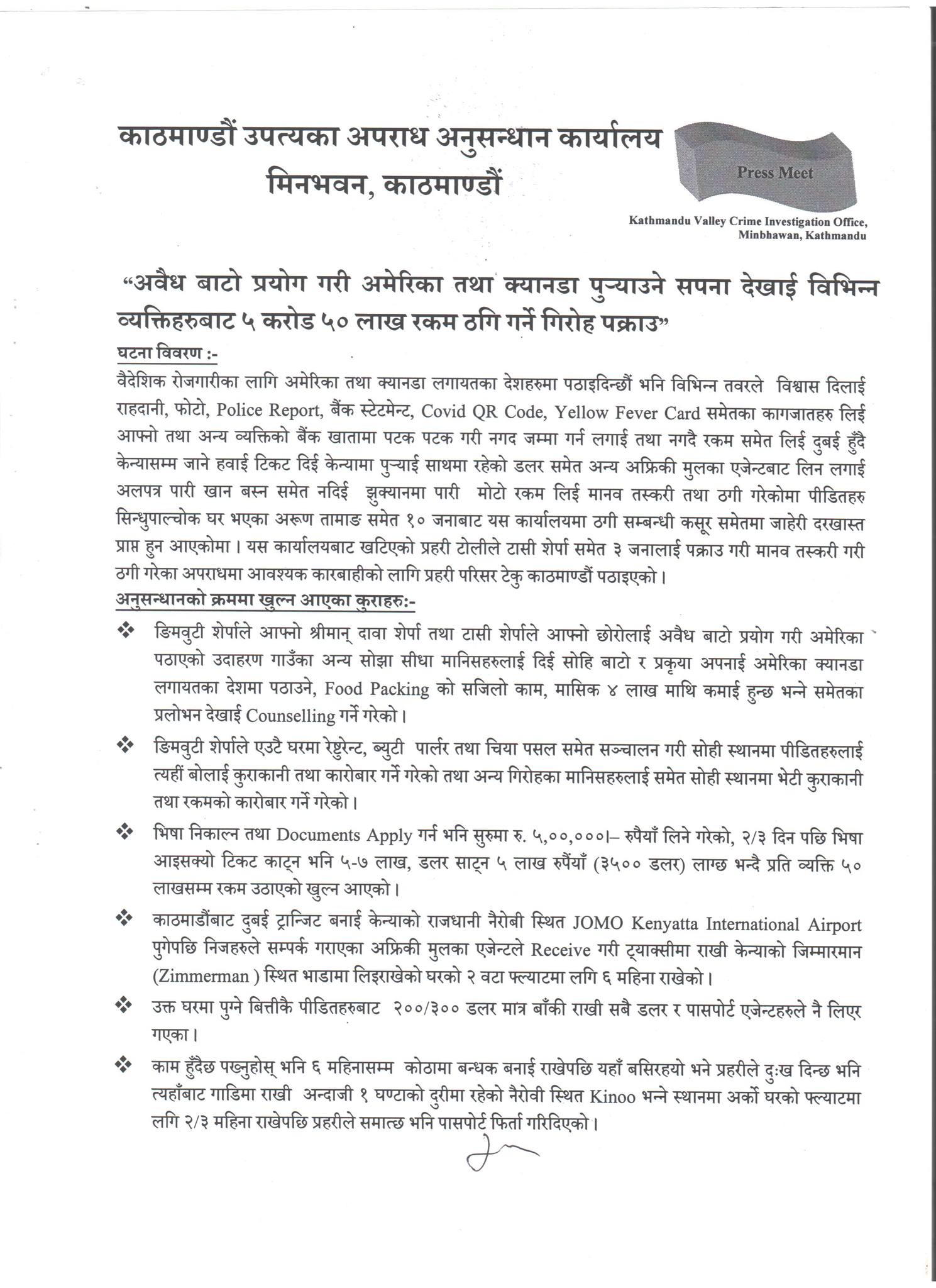 उनीहरुले सिन्धुपाल्चोक घर भएका अरूण तामाङ समेत १० जनाबाट वैदेशिक रोजगारीका लागि अमेरिका तथा क्यानडा लगायतका देशहरुमा पठाईदिन्छौं भनि विभिन्न तवरले विश्वास दिलाई राहदानी, फोटो, पुलिस रिपोर्ट, बैंक स्टेटमेन्ट, कोभिड क्युआर कार्डसमेतका कागजातहरु लिई आफ्नो तथा अन्य व्यक्तिको बैंक खातामा पटक पटक गरी नगद जम्मा गर्न लगाई तथा नगदै रकम समेत लिई दुबई हुँदै केन्यासम्म जाने हवाई टिकट दिई केन्यामा पुर्याई साथमा रहेको डलर समेत अन्य अफ्रिकी मुलका एजेन्टबाट लिन लगाई केन्यामा ६ महिनासम्म बन्धक बनाएर खान बस्न समेत नदिई झुक्यानमा पारी मोटो रकम लिई मानव तस्करी तथा ठगी गरेको काठमाडौं उपत्यका अपराध अनुसन्धान कार्यालयले जनाएको छ।