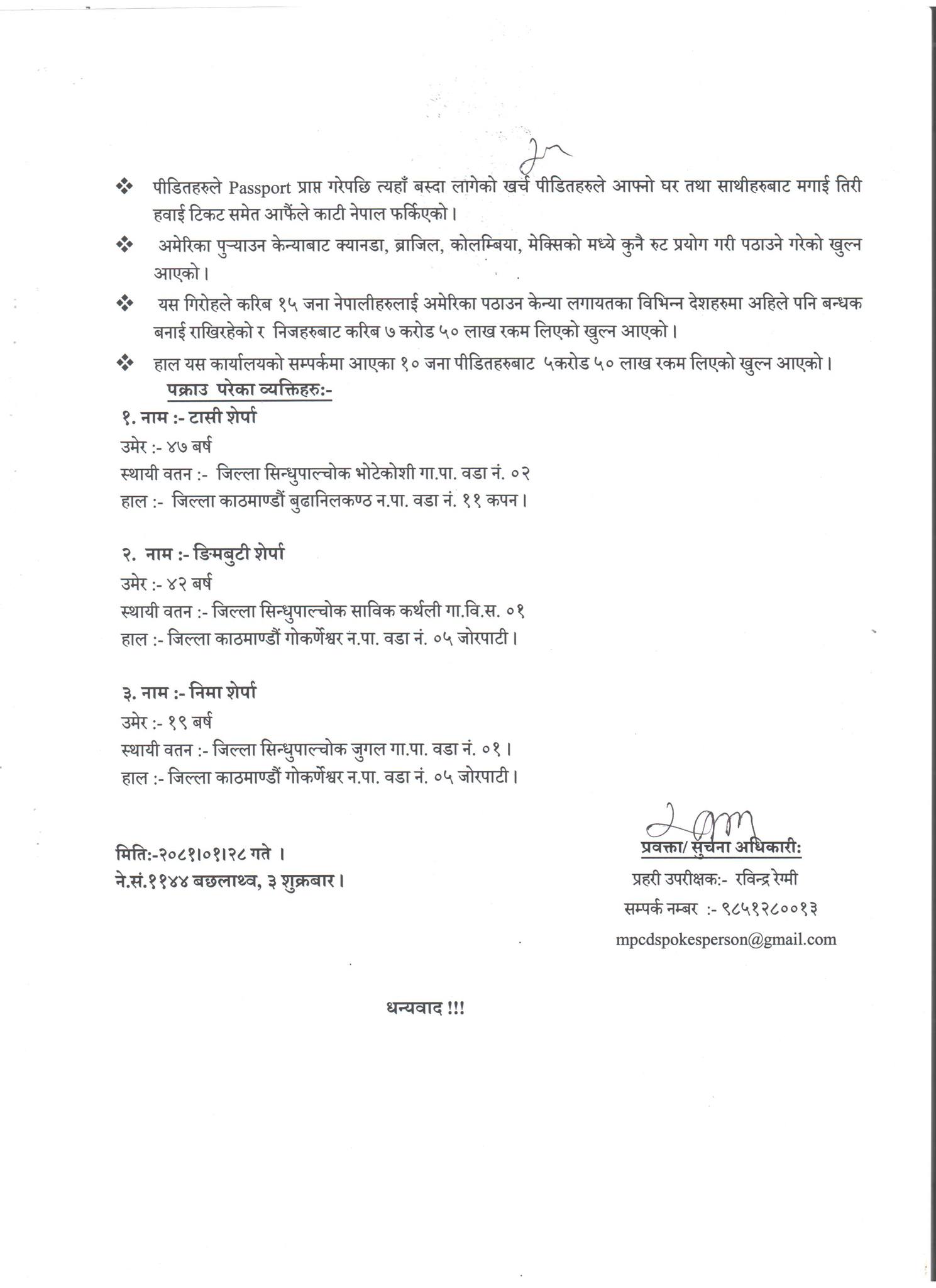 उनीहरुलाई थप अनुसन्धान तथा कारबाहीको लागि मानव तस्करी गरी ठगी गरेका अपराधमा प्रहरी परिसर टेकु काठमाडौँ पठाइएको छ ।
