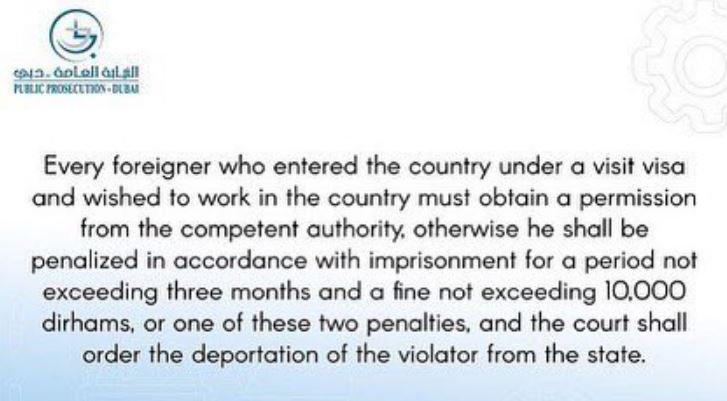 चेतावनी अनुसार युएईमा आवश्यक वर्क परमिट नलिई काम गरे कडा कारबाही भोग्नुपर्नेछ, जसमा तीन महिनाको जेल र १० हजार दिह्रामसम्मको जरिवाना समावेश हुन सक्छ । जारी ध्यानाकर्षणमा उल्लेख छ 'भिजिट भिसा अन्तर्गत स्वदेश प्रवेश गर्ने र काम गर्न चाहने प्रत्येक विदेशीले सम्बन्धित निकायबाट अनिवार्य अनुमति लिनुपर्छ, अन्यथा तिनलाई तीन वर्षसम्म कैद सजाय वा दश हजार रुपैयाँभन्दा बढी जरिवाना वा यी दुईमध्ये कुनै एक जरिवाना हुनेछ । साथै अदालतले राज्यबाट निष्कासन गर्न आदेश दिनेछ ।'