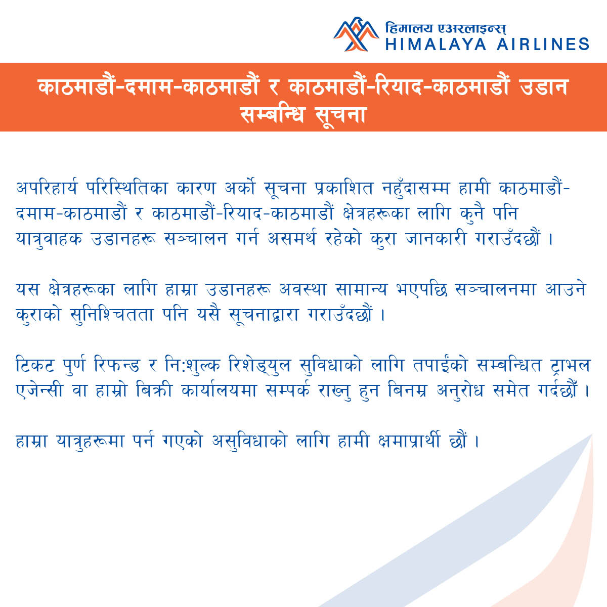 यसैबीच एयरलाइन्सले अपरिहार्य परिस्थितिको कारण भन्दै अब साउदीको दम्माम र रियादबाट काठमाडौँसम्म जाने-आउने उडान नहुने सूचना जारी गरेको छ ।