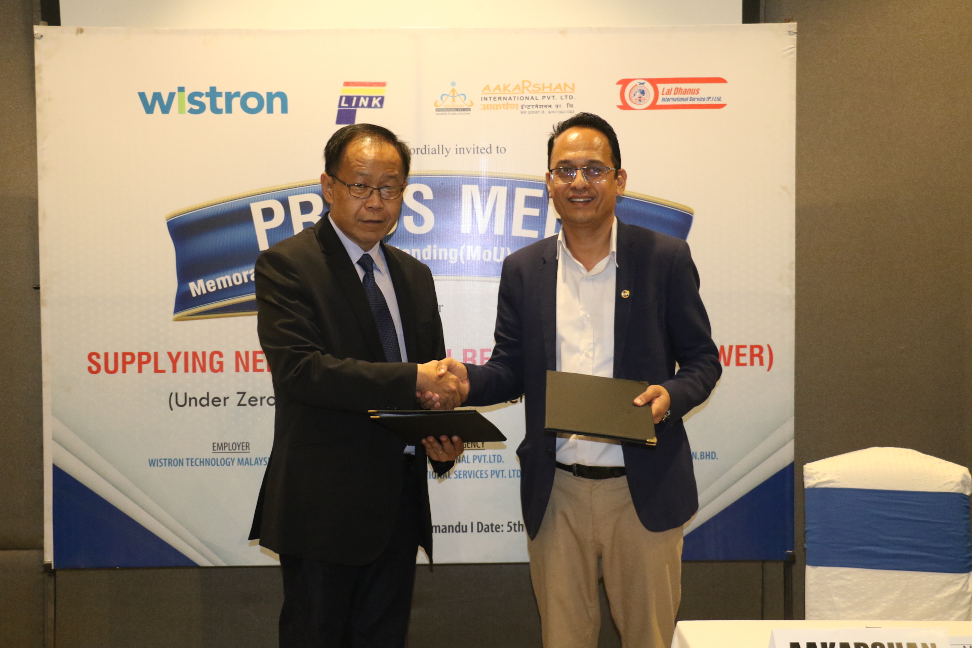 मंगलबार काठमाडौंमा आयोजित एक कार्यक्रममा मलेसियाको विर्स्टन टेक्नोलोजी र नेपालस्थित मेनपावर कम्पनी आकर्षण इन्टरनेसनल र लालधनुष इन्टरनेसनलबीच द्विपक्षीय सम्झौता भएको छ।