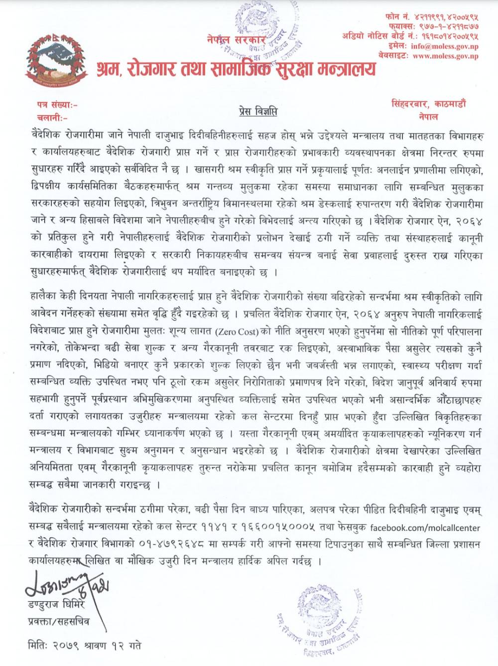 साउन १२, काठमाडौँ । श्रम रोजगार तथा सामाजिक सुरक्षा मन्त्रालयले प्रचलित वैदेशिक रोजगार ऐन २०६४ बिपरित काम भईरहेकोमा सतर्कता अपनाउन ध्यानाकर्षण गर्दै बिज्ञप्ति जारी गरेको छ । जारी बिज्ञप्तिमा मन्त्रालयले ऐन बिपरित काम गर्नेहरु बिरुद्ध उजुरी दिन अपिल समेत गरेको छ ।