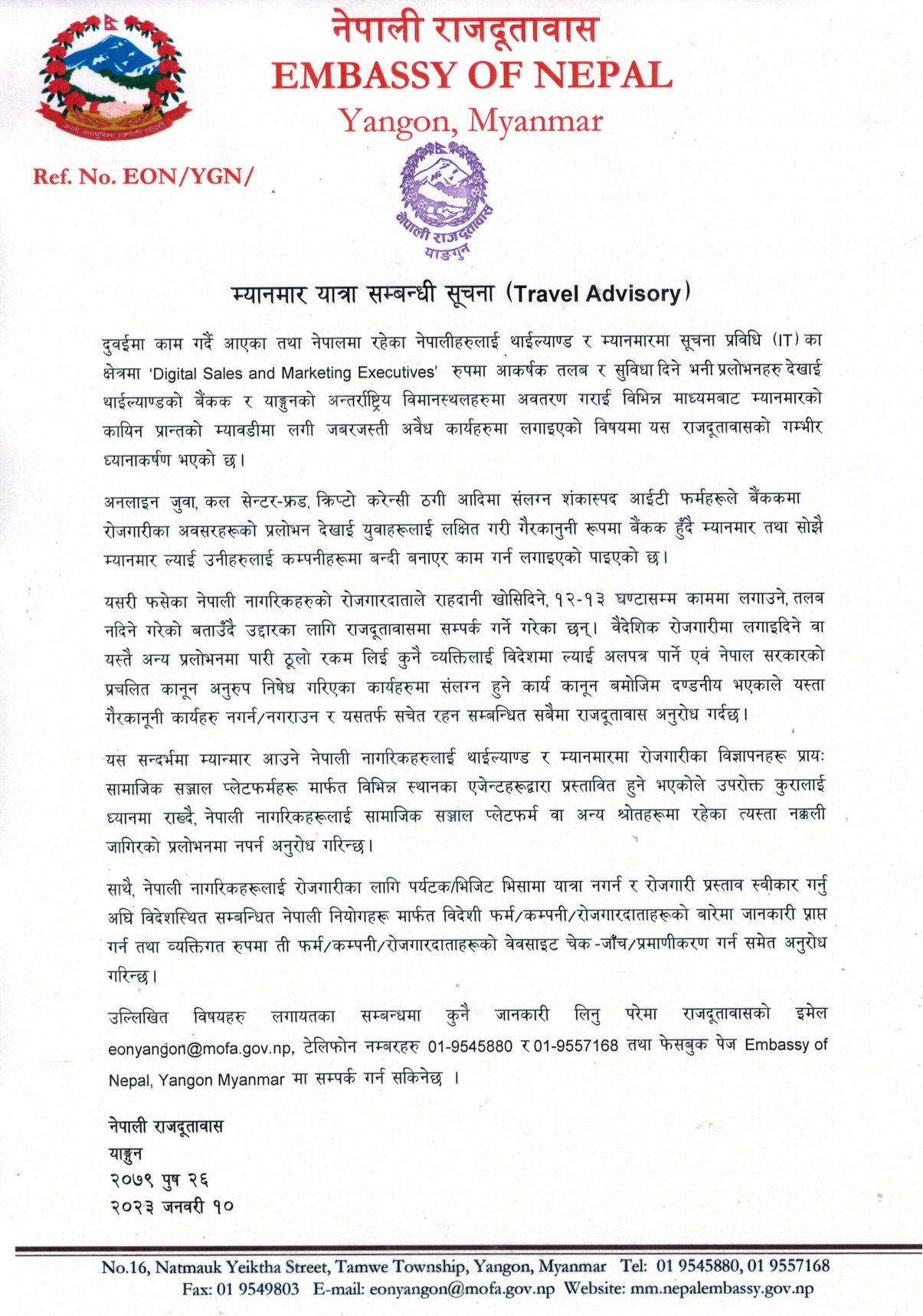 माघ २६, काठमाडौँ | म्यानमारस्थित नेपाली राजदूतावास आईटी कम्पनीमा आकर्षक तलब दिने नाममा नेपालीलाई थाइल्यान्ड र म्यानमारमा पुर्याएर बन्धक बनाउँदै अनलाइन ठगीमा लगाउने गिरोह सक्रिय रहेको जनाएको छ ।