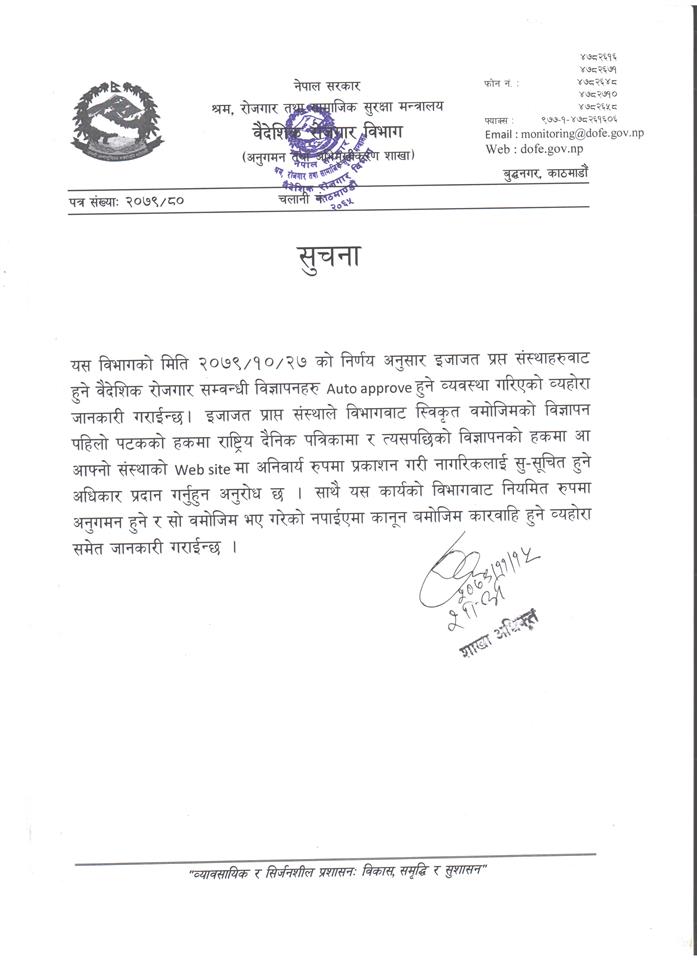 वैदेशिक रोजगार विभागले सोमबार एक सूचना प्रकाशित गर्दै यस्तो व्यवस्थाबारे जानकारी गराएको हो । विभागका अनुसार इजाजत प्राप्त संस्थाबाट हुने वैदेशिक रोजगार सम्बन्धी विज्ञापन ‘अटो अप्रुभ’ हुने व्यवस्था गरिएको छ ।