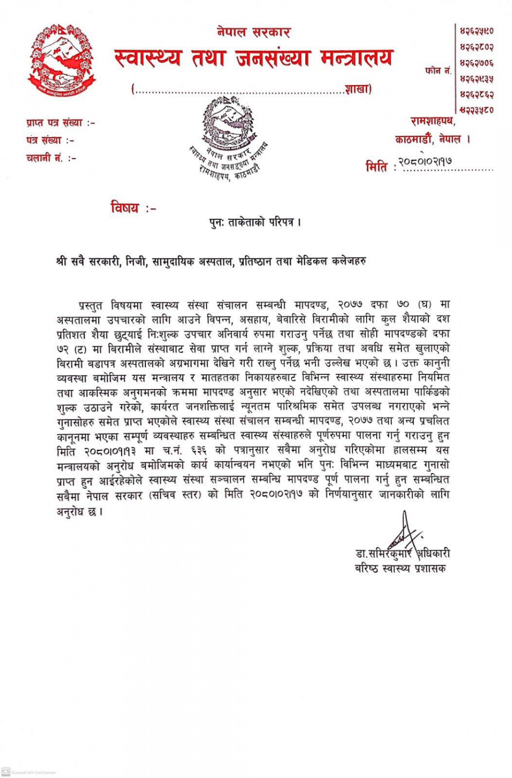 मन्त्रालयले आज सबै सरकारी, निजी, सामुदायिक अस्पताल, प्रतिष्ठान तथा मेडिकल कलेजहरुलाई १० प्रतिशत शय्या छुट्याएर नि:शुल्क उपचार गर्न ताकेता गरेको हो ।