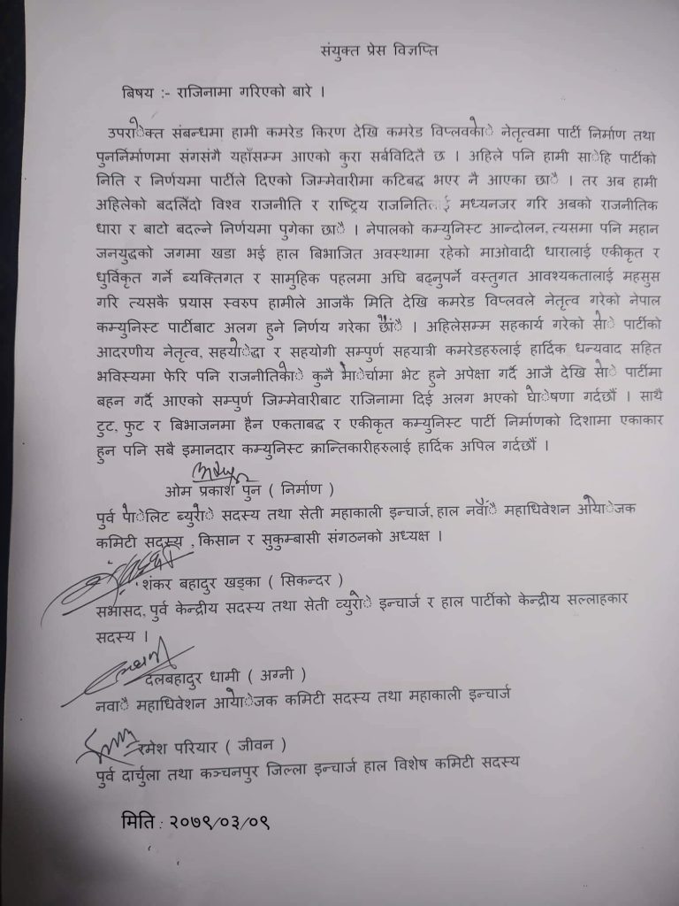 ‘नेपालको कम्युनिस्ट आन्दोलन, त्यसमा पनि महान जनयुद्धको जगमा खडा भई हाल विभाजित अवस्थामा रहेको माओवादी धारालाई एकीकृत र ध्रुविकृत गर्ने व्यक्तिगत र सामूहिक पहलमा अघि बढ्नुपर्ने वस्तुगत आवश्यकतालाई महसुस गरि त्यसकै प्रयास स्वरूप हामीले आजकै मितिदेखि कमरेड विप्लवले नेतृत्व गरेको नेपाल कम्युनिस्ट पार्टीबाट अलग हुने निर्णय गरेका छौं,’ संयुक्त विज्ञप्तिमा भनिएको छ, ‘अहिलेसम्म सहकार्य गरेको सो पार्टीको आदरणीय नेतृत्व, सहयोद्धा र सहयोगी सम्पूर्ण सहयात्री कमरेडहरुलाई हार्दिक धन्यवादसहित भविस्यमा फेरि पनि राजनीतिका कुनैमा भेट हुने अपेक्षा गर्दै आजदेखि सो पार्टीमा बहन गर्दै आएको सम्पूर्ण जिम्मेवारीबाट राजीनामा दिई अलग भएको घोषणा गर्दछौं ।’