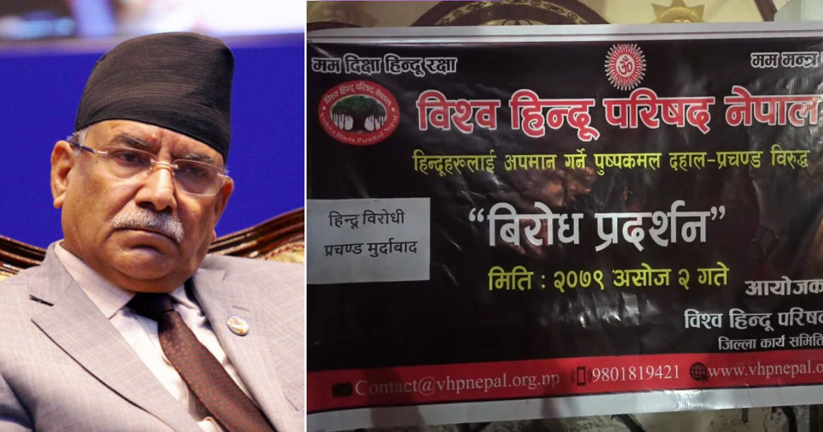 असोज ३, काठमाडौं | हिन्दू धर्मविरुद्ध सार्वजनिक अभिव्यक्ती दिएको भन्दै विश्व हिन्दु परिषद नेपालले नेकपा माओवादी केन्द्रका अध्यक्ष पुष्पकमल दहाल प्रचण्डको विरोध प्रदर्शन गरेको छ ।