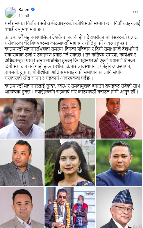 मंसिर ८, काठमाडौं | काठमाडौं महानगरपालिकाका मेयर बालेन साहले काठमाडौं क्षेत्रबाट प्रतिनिधि सभामा निर्वाचित उमेदवारलाई बधाई दिएका छन्। बिहिबार सामाजिक सञ्जालमा निर्वाचित हुने उमेदवारको फोटोसहित स्टाटस राख्दै शुभकामना दिएका हुन्।