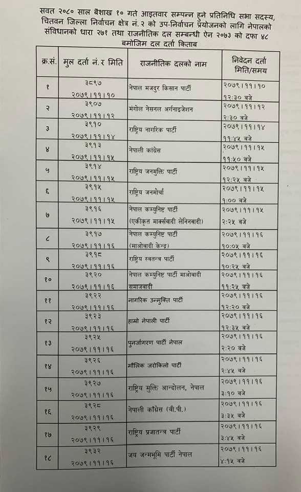 उपनिर्वाचनमा भाग लिनका लागि हालसम्म दर्ता भएका दलहरु निम्न अनुसार छन्: