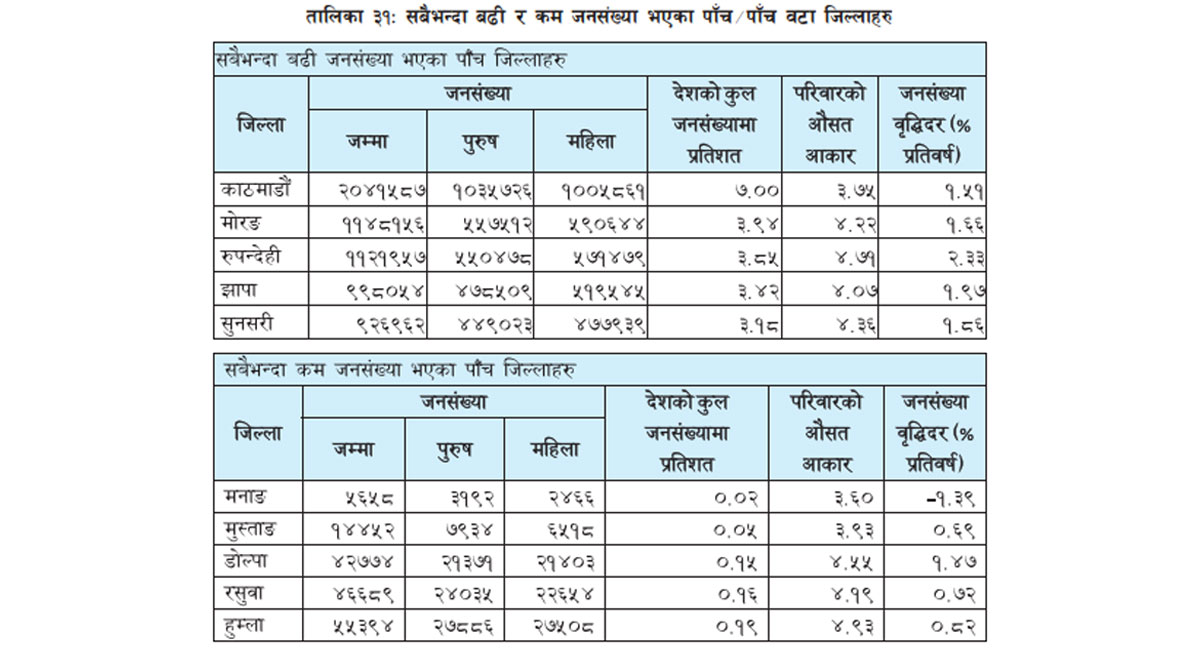 धेरै जनसंख्या हुने जिल्लामा काठमाडौंपछि मोरङ, रुपन्देही, झापा र सुनसरी रहेका छन्। यस्तै, कम जनसंख्या हुने जिल्लामा मनाङपछि क्रमशः मुस्ताङ, डोल्पा, रसुवा र हुम्ला रहेका छन्।