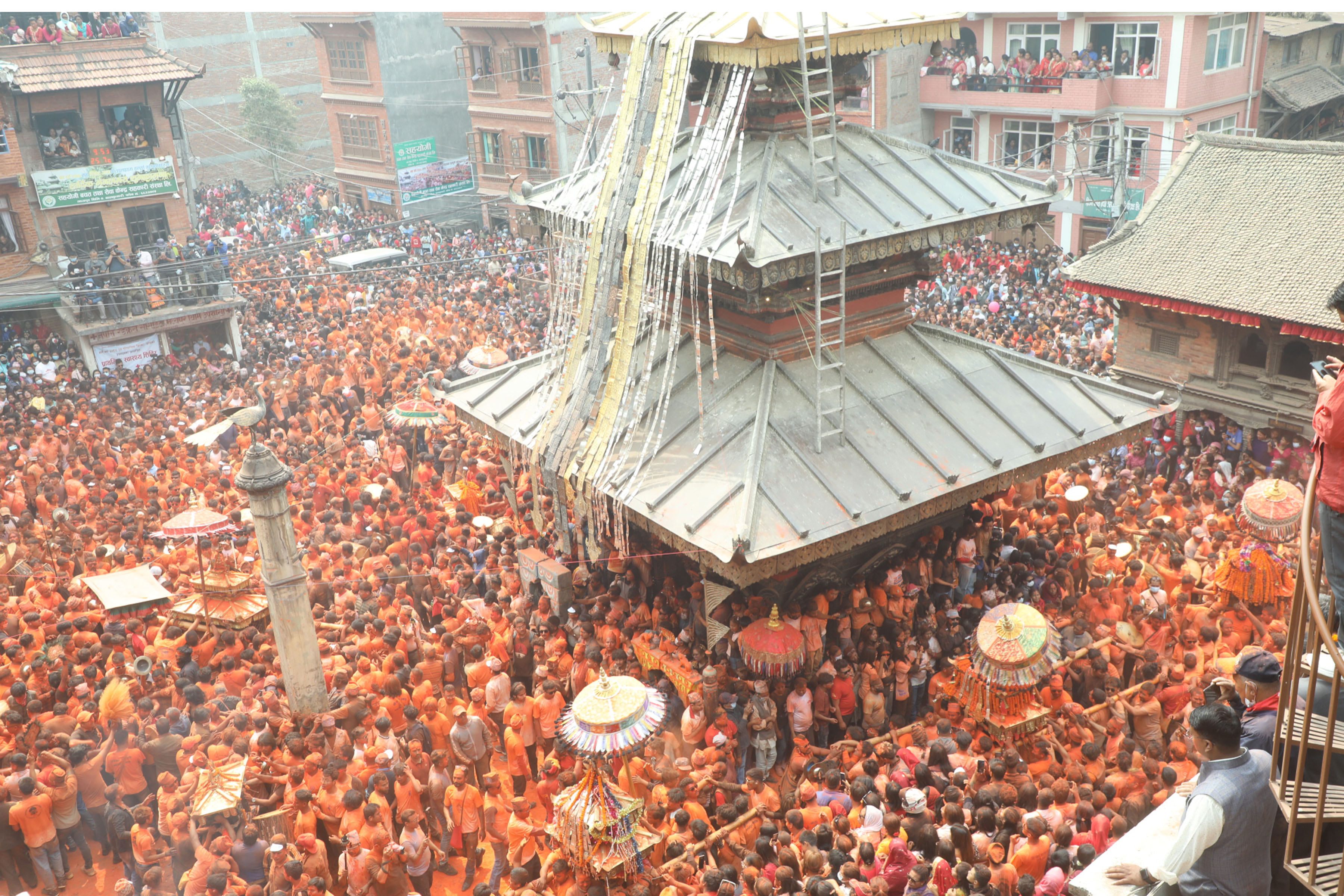 बैशाख २, भक्तपुर | हरेक वर्ष मध्यपुर थिमिमा मनाईने बिस्का : जात्राको अवसरमा मध्यपुरथिमिका वासिन्दाले शनिबार विहानैदेखि टोलटोलमा २६ खट जात्रा गरि बालकुमारीमा ल्याएर हर्षोल्लासका साथ सिन्दुर खेलेर सुथः सिया जात्रा मनाउने क्रममा हातहातमा चिराग बोकेर घुम्दै ।