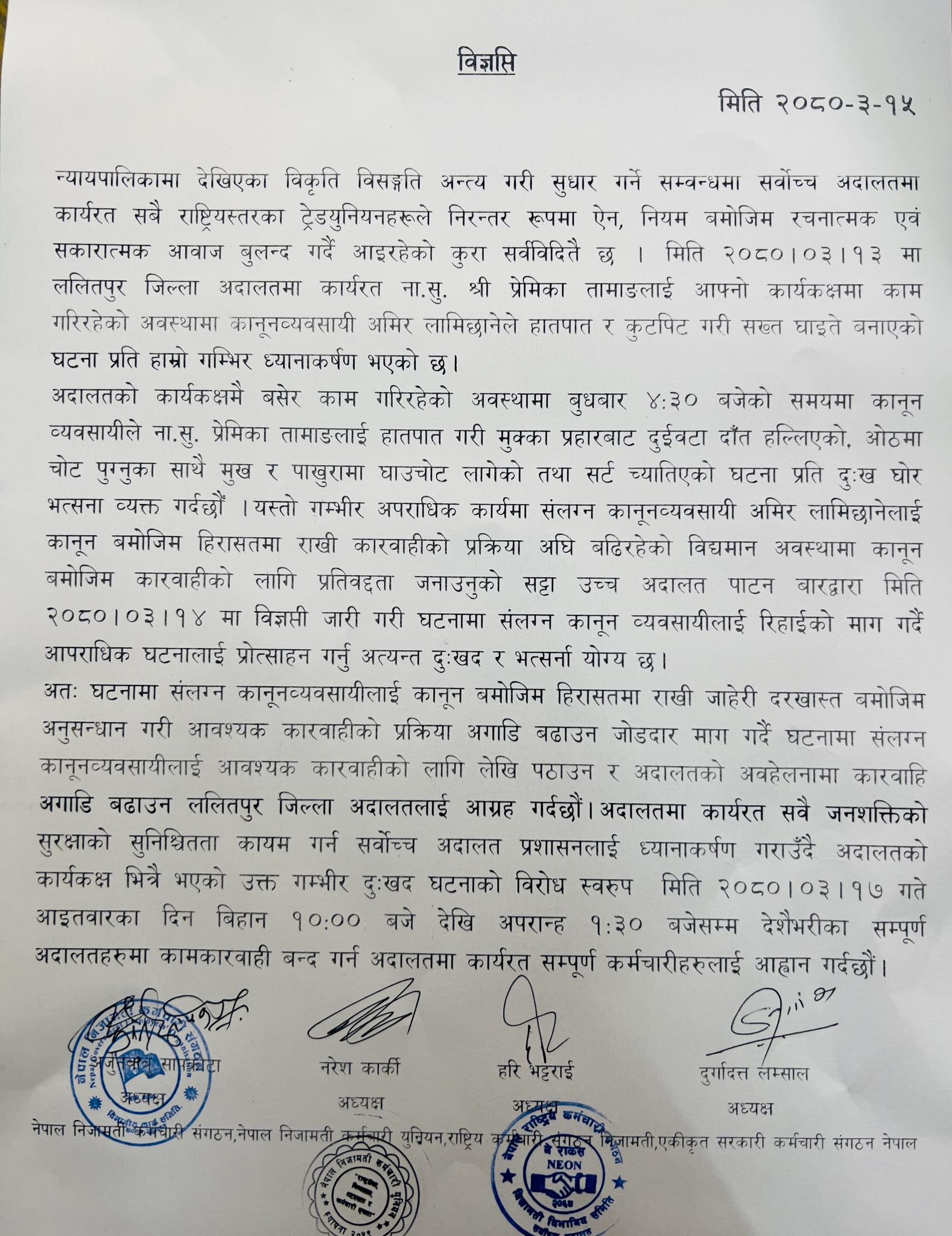 संयुक्त विज्ञप्तिमा कार्यकक्षभित्रै कर्मचारी कुटपिट गर्ने कानुन व्यवसायीलाई रिहाइ गर्न उच्च अदालत बार ललितपुरले विज्ञप्ति निकालेको भन्दै आपराधिक घटनालाई बारले प्रोत्साहन गर्नु अत्यन्त दुःखद र भर्त्सना योग्य रहेको भन्दै बिराेध गरेको छ । त्यसैगरी कर्मचारीको सुरक्षाको ग्यारेन्टी गर्न पनि सर्वोच्च अदालत प्रशासनको ध्यानाकर्षण गराएको छ ।