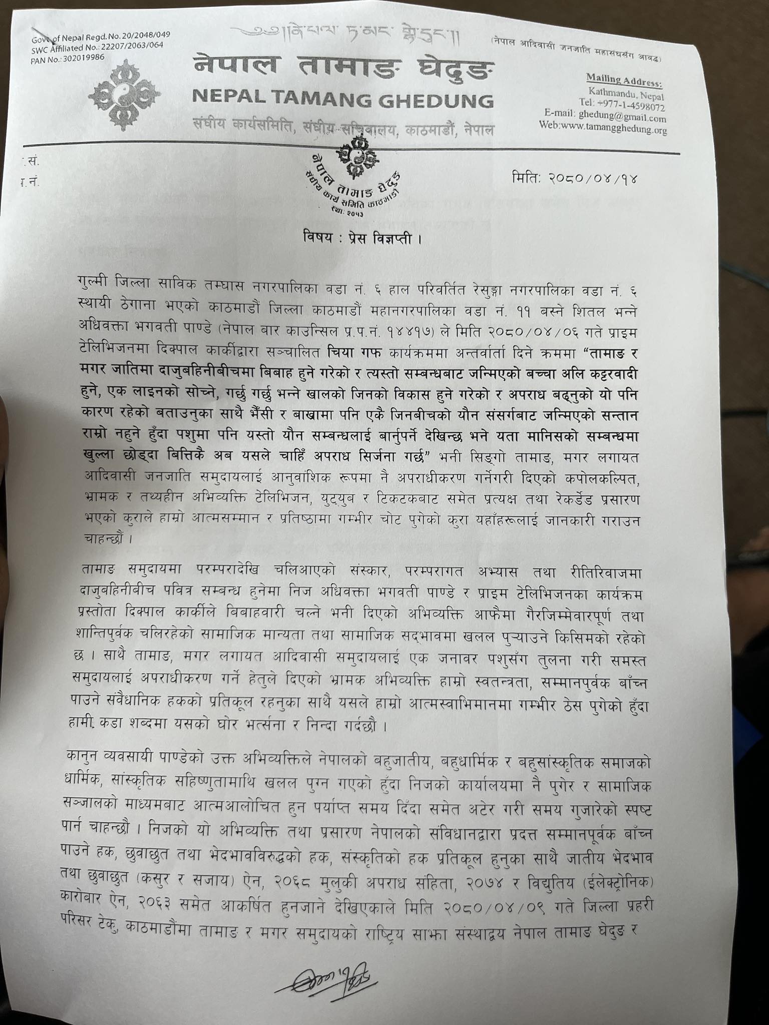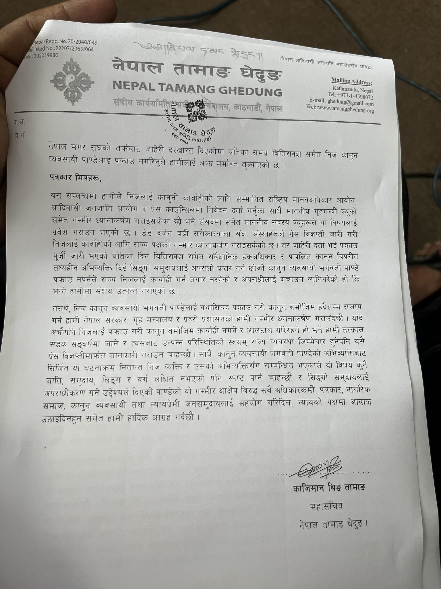 अधिवक्ता पाण्डेले तामाङ, मगर समुदायलाई अपराधी करार गर्ने किसिमको अभिव्यक्ति दिएको संघले आरोप लगाएको छ । उनलाई हालसम्म पक्राउ नगरिएकाे प्रति संघले आपत्ति जनाउँदै कारबाहीकाे माग गरेकाे छ ।