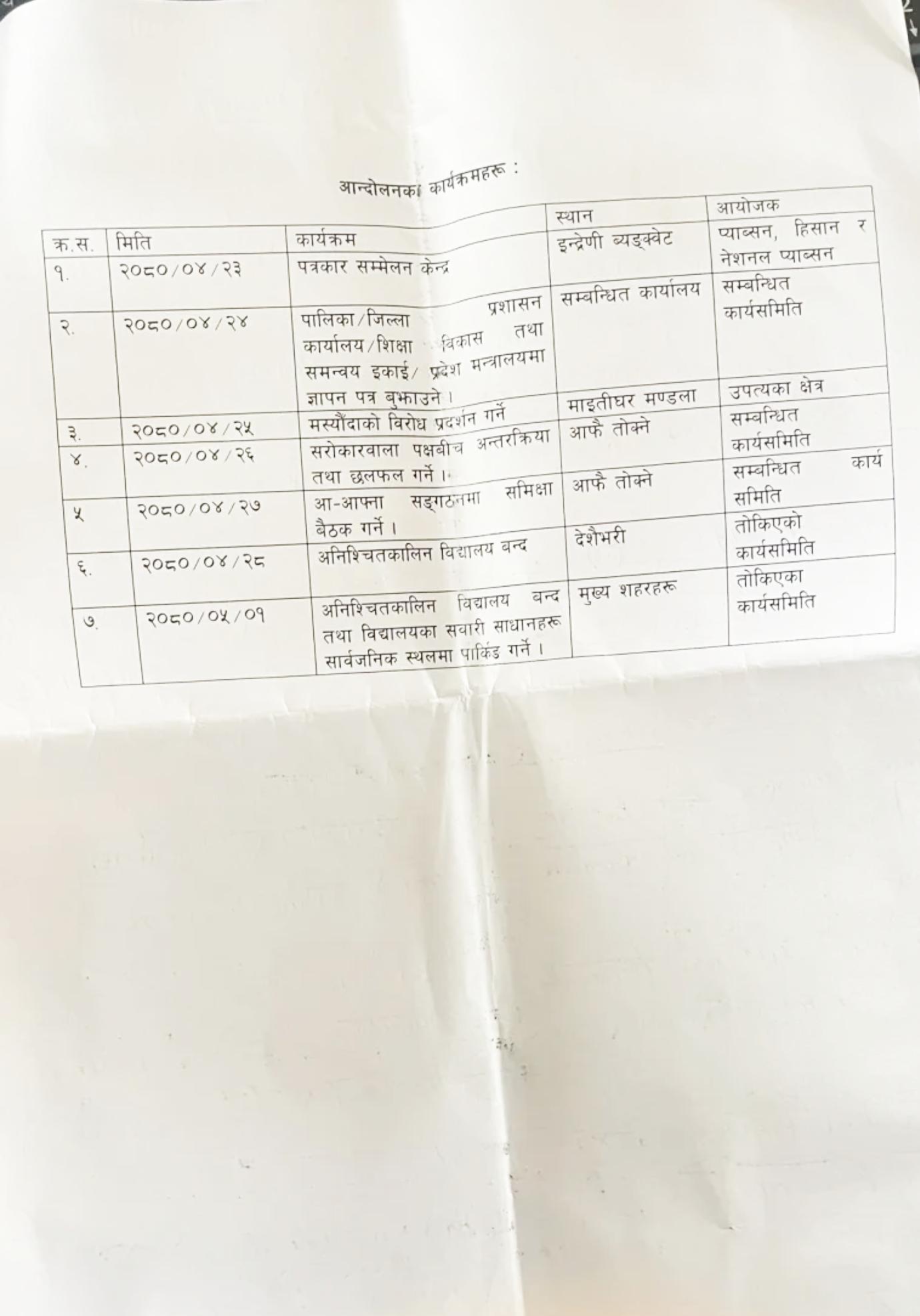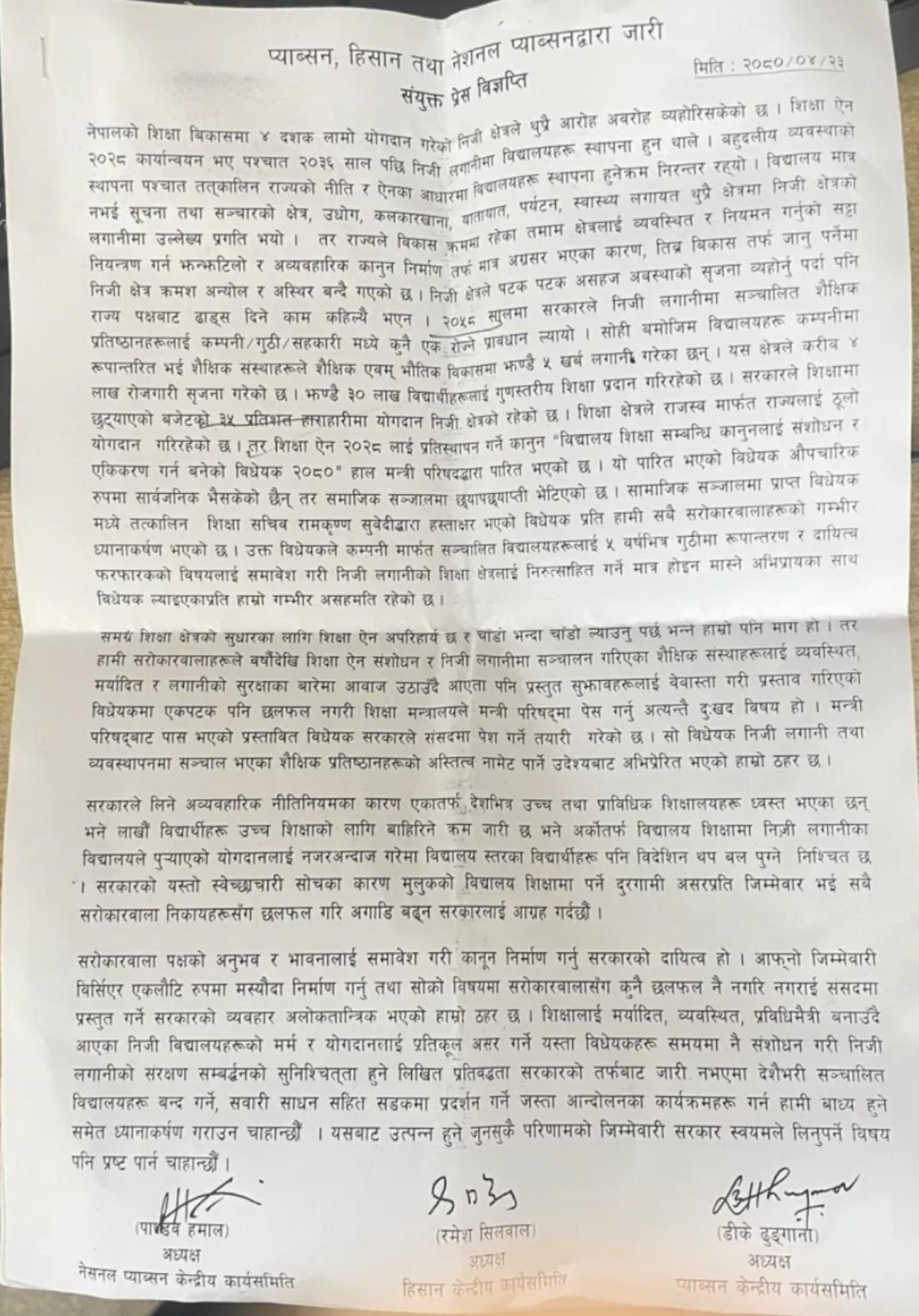 विद्यालय शिक्षा ऐनको मस्यौदा लिखित रुपमै सरकारले प्रतिवद्धता नजनाएसम्म घोषित आन्दोलन फिर्ता नलिने जारी विज्ञप्तिमा उल्लेख छ ।