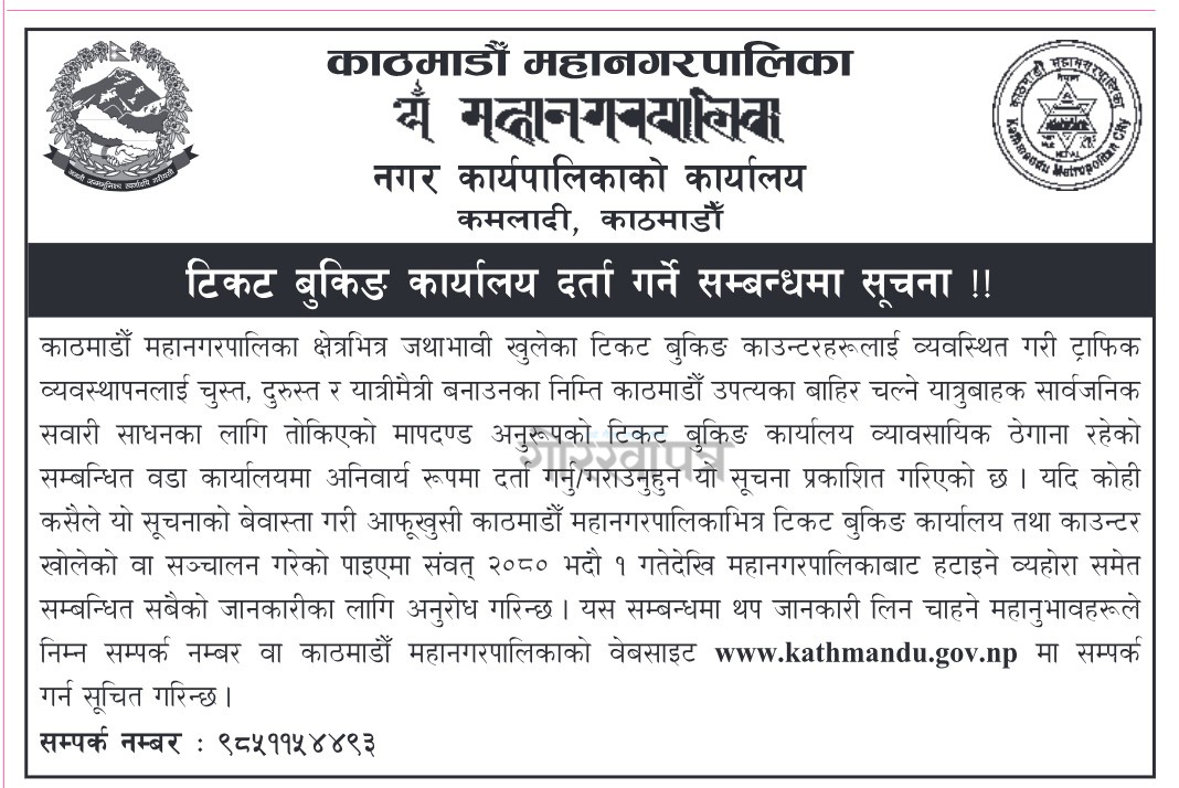 साउन २७, काठमाडौँ | काठमाडौँ महानगरपालिकाले हाल सञ्चालनमा रहेका टिकट बुकिङ काउन्टरहरू भदौ १ गते देखि हटाइने जनाएको छ । लामो तथा छोटो दुरीमा सञ्चालन हुने यातायातका लागि काटिने टिकट काउन्टर दर्ता गरेर मात्र सञ्चालन गर्नु पर्ने भन्दै हटाउने जनाएको हो ।