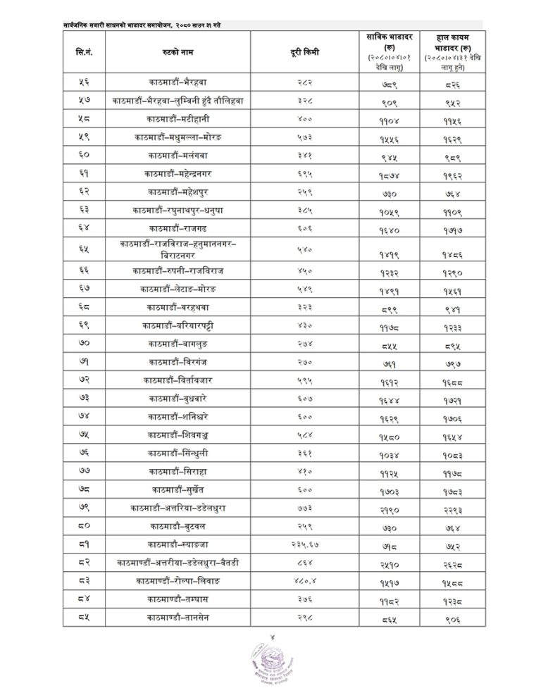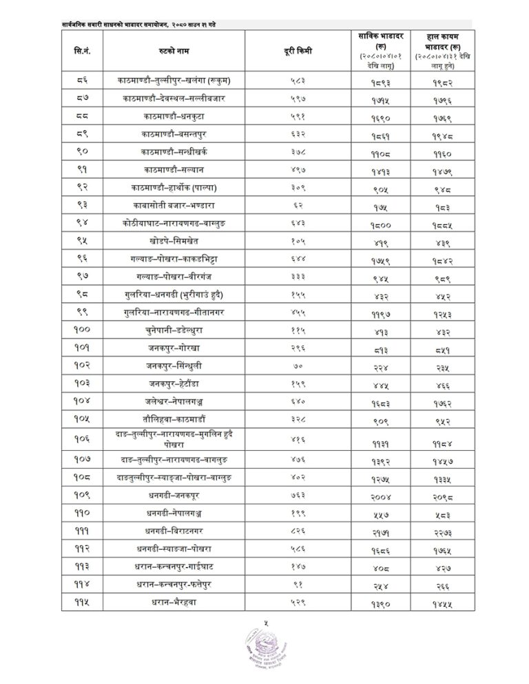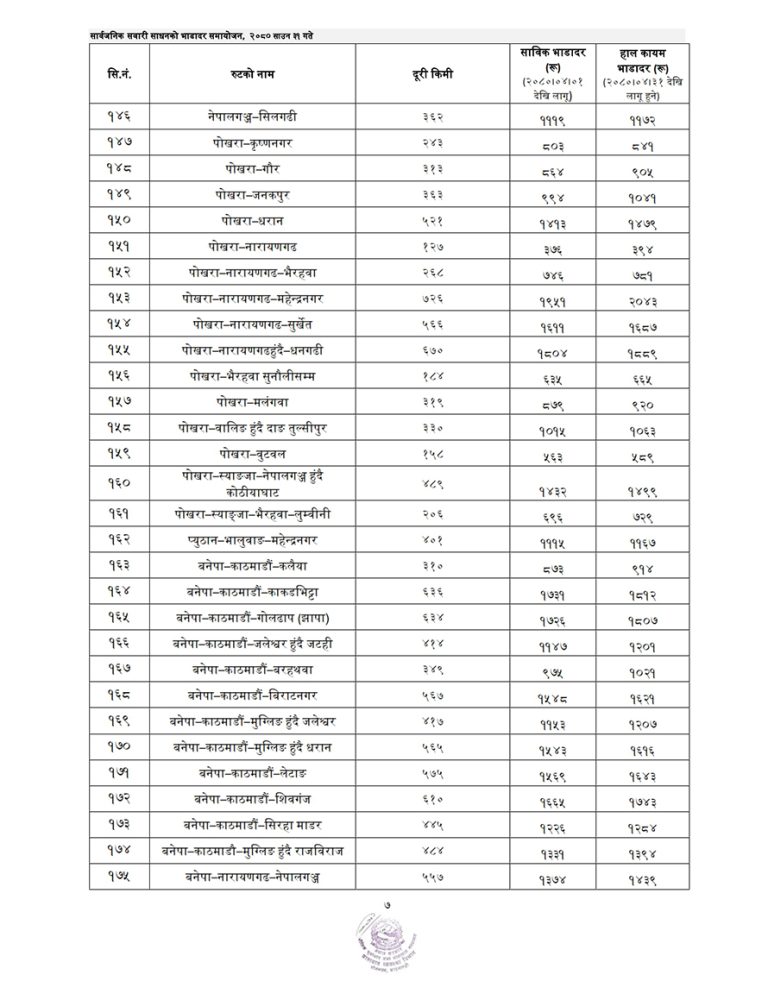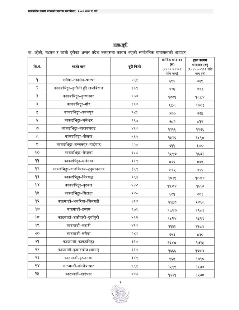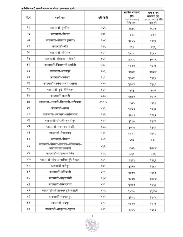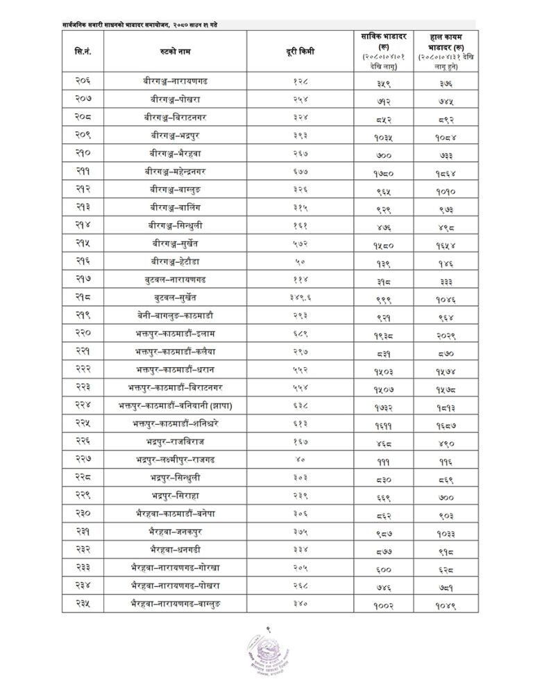 बढेको भाडादर आजैबाट लागु भएको हो । विभागका अनुसार यो भाडा दुई वा सो भन्दा बढी प्रदेश अथवा राष्ट्रिय स्तरमा सञ्चालन हुने सार्वजनिक यातायातमा मात्र लागु हुने भएको छ ।
