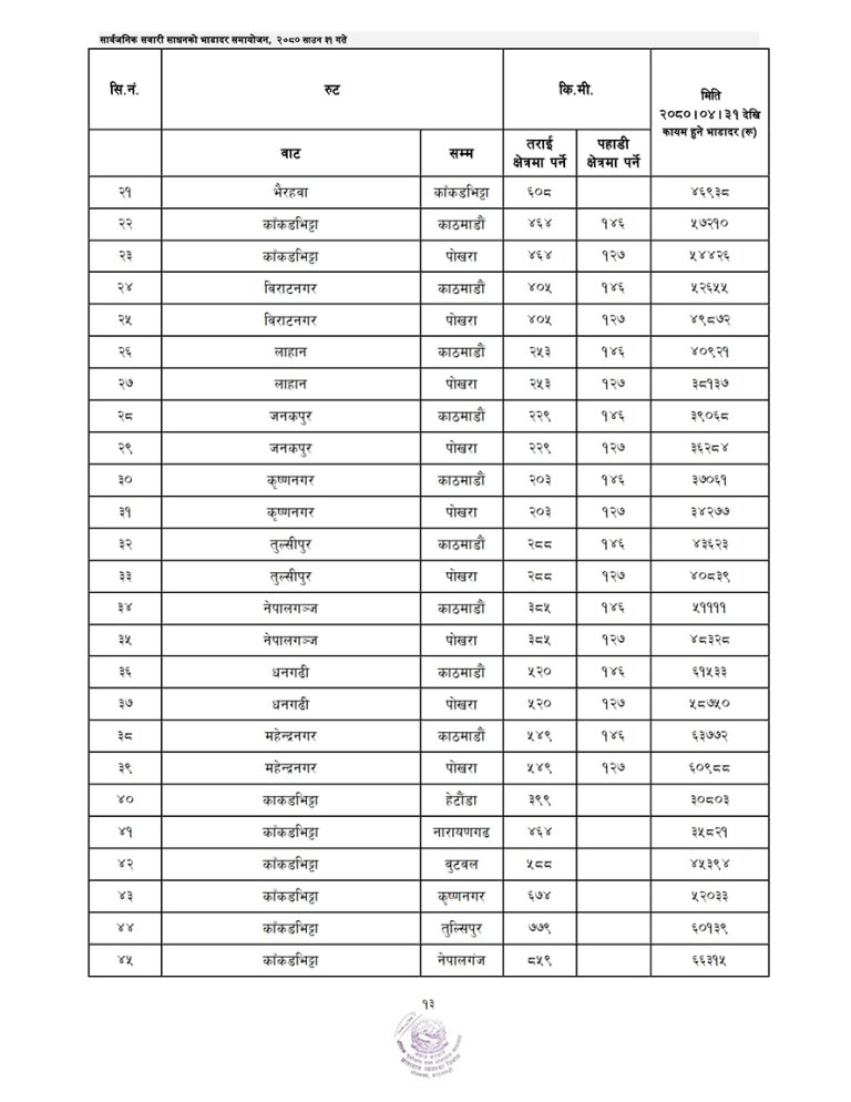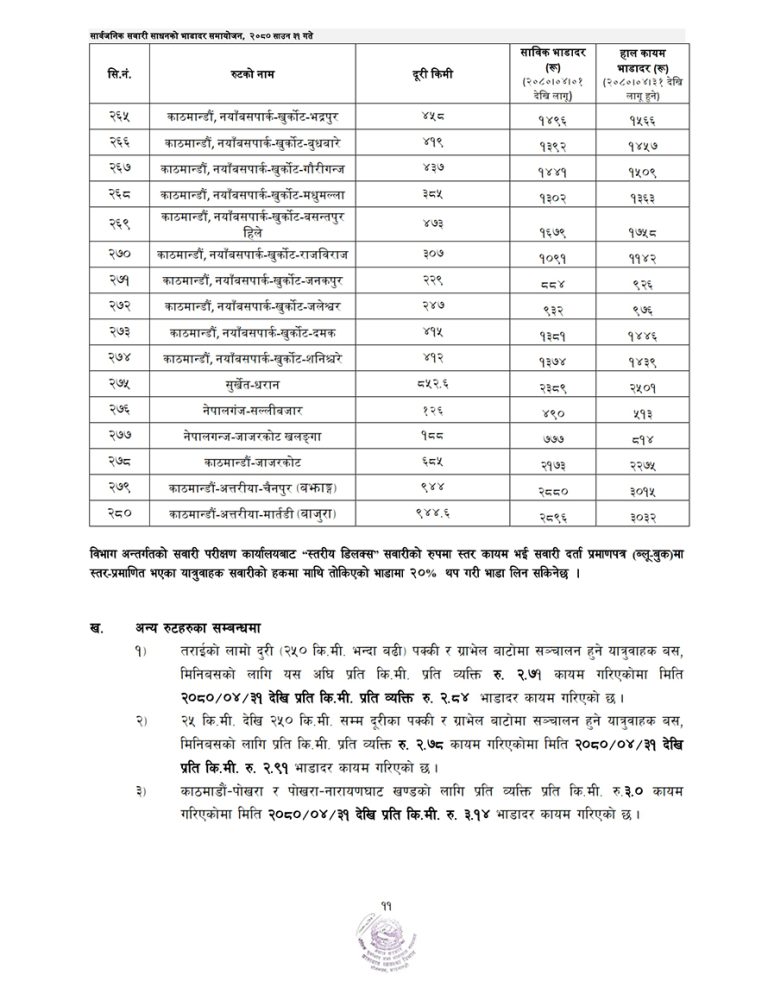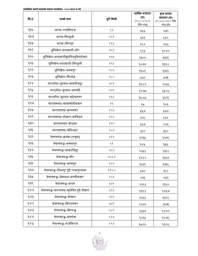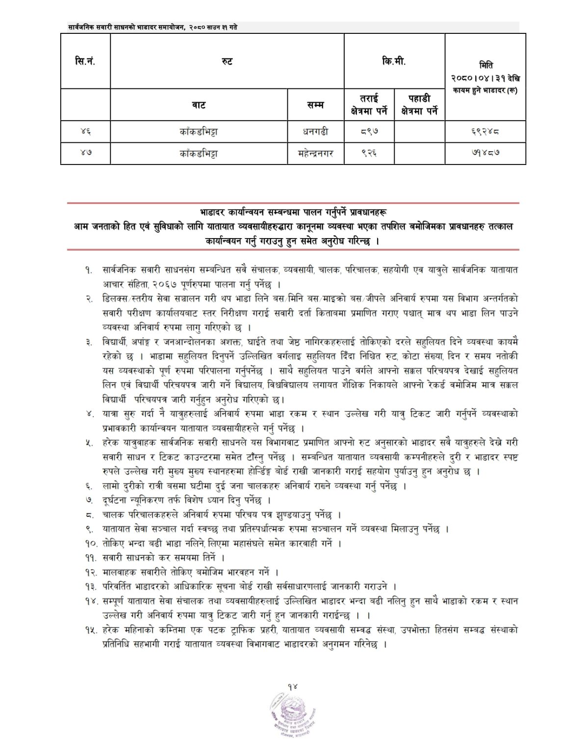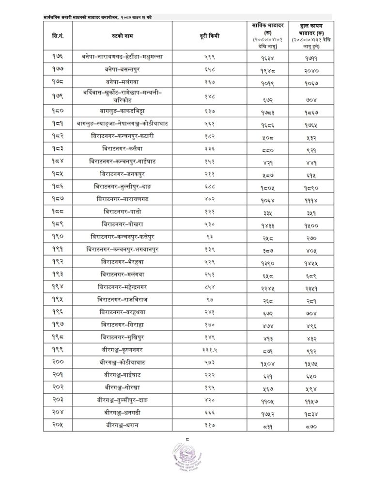 बढेको भाडादर आजैबाट लागु भएको हो । विभागका अनुसार यो भाडा दुई वा सो भन्दा बढी प्रदेश अथवा राष्ट्रिय स्तरमा सञ्चालन हुने सार्वजनिक यातायातमा मात्र लागु हुने भएको छ ।