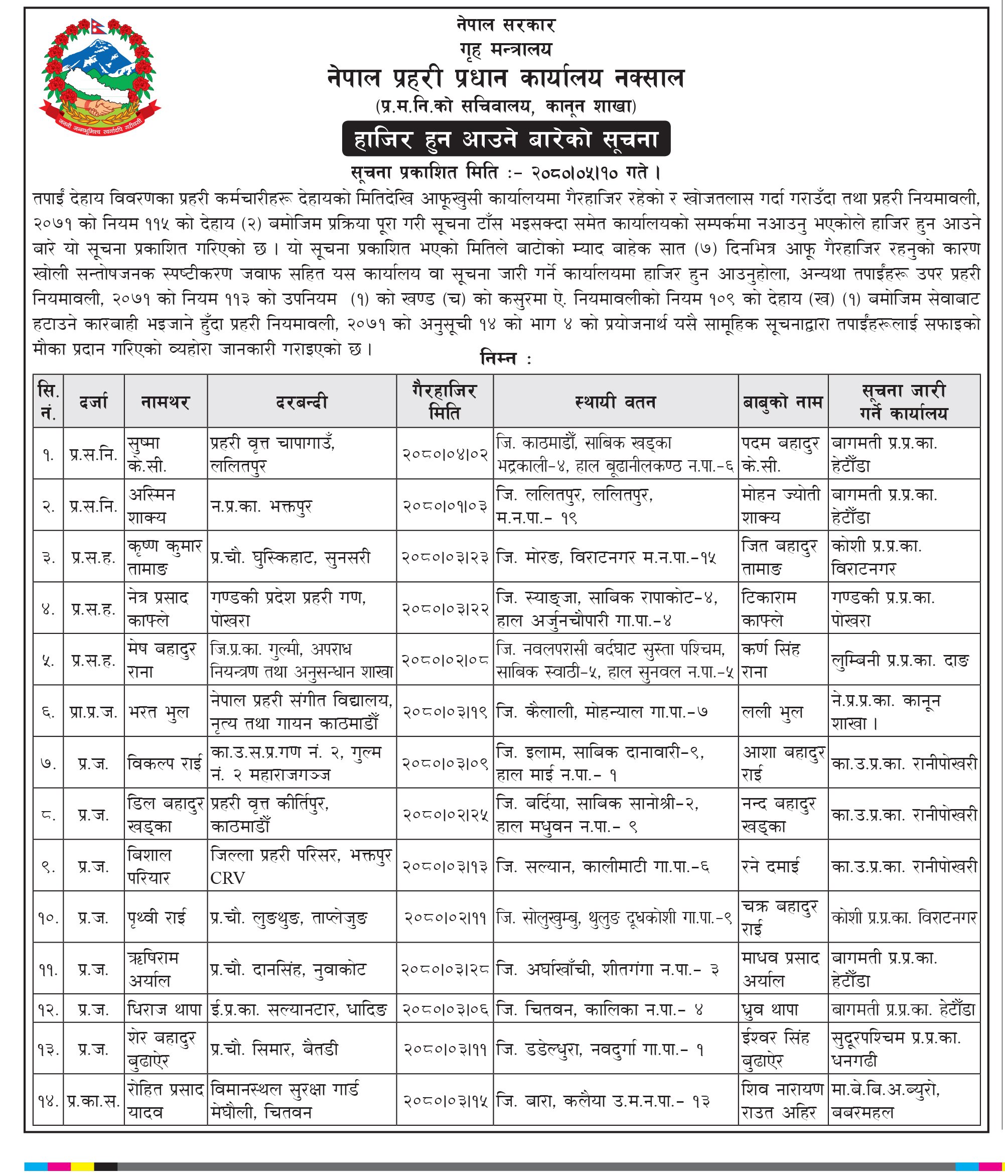 तोकिएको समयमा हाजिर नभए नियमानुसार जागिरबाट हटाइने चेतावनी समेत दिएको छ । 'आफूखुसी कार्यालयमा गैरहाजिर रहेको र खोजतलास गर्दा गराउँदा समेत कार्यालयको सम्पर्कमा नआउनु भएकोले हाजिर हुन आउनेबारे यो सूचना प्रकाशित गरिएको छ । सूचना प्रकाशित भएको मितिले बाटोको म्याद बाहेक सात (७) दिनभित्र आफू गैरहाजिर रहनुको कारण खोली सन्तोषजनक स्पष्टीकरण जवाफसहित यस कार्यालय वा सूचना जारी गर्ने कार्यालयमा हाजिर हुन आउनुहोला,; सूचनामा भनिएको छ, 'अन्यथा तपाईंहरू उपर प्रहरी नियमावली, २०७१ को नियम ११३ को उपनियम (१) को खण्ड (च) को कसुरमा ऐ. नियमावलीको नियम १०९ को देहाय (ख) (१) बमोजिम सेवाबाट हटाउने कारबाही भइजाने हुँदा प्रहरी नियमावली, २०७१ को अनुसूची १४ को भाग ४ को प्रयोजनार्थ यसै सामूहिक सूचनाद्वारा तपाईंहरूलाई सफाइको मौका प्रदान गरिएको व्यहोरा जानकारी गराइएको छ ।'
