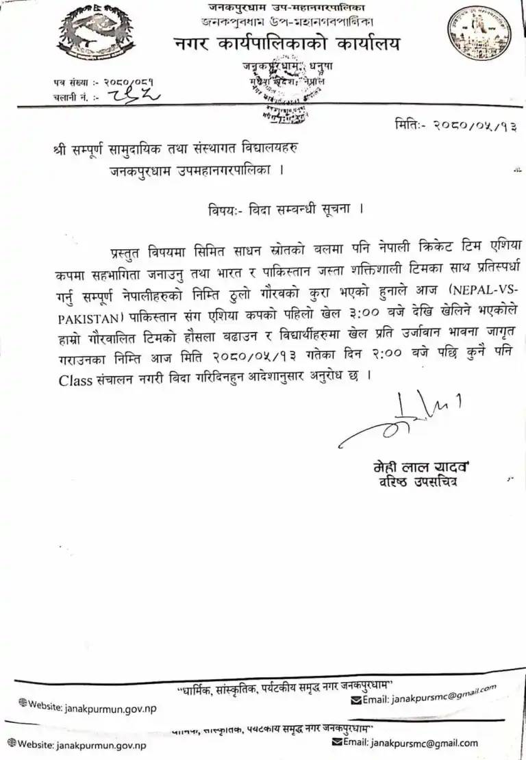 यादवले जारी गरेको विज्ञप्तिमा भनिएको छ ‘प्रस्तुत विषयमा सिमित साधन स्रोतको बलमा पनि नेपाली क्रिकेट टिम एशिया कपमा सहभागिता जनाउनु तथा भारत र पाकिस्तान जस्ता शक्तिशाली टिमका साथ प्रतिस्पर्धा गर्नु सम्पूर्ण नेपालीहरुको निम्ति ठुलो गौरवको कुरा भएको हुनाले आज (NEPAL-VS- PAKISTAN) पाकिस्तान संग एशिया कपको पहिलो खेल ३:०० बजे देखि खेलिने भएकोले हाम्रो गौरवालित टिमको हौसला बढाउन र विद्यार्थीहरुमा खेल प्रति उर्जावान भावना जागृत गराउनका निम्ति आज मिति २०८०/०५/१३ गतेका दिन २:०० बजे पछि कुनै पनि Class संचालन नगरी बिदा गरिदिनहुन आदेशानुसार अनुरोध छ ’।