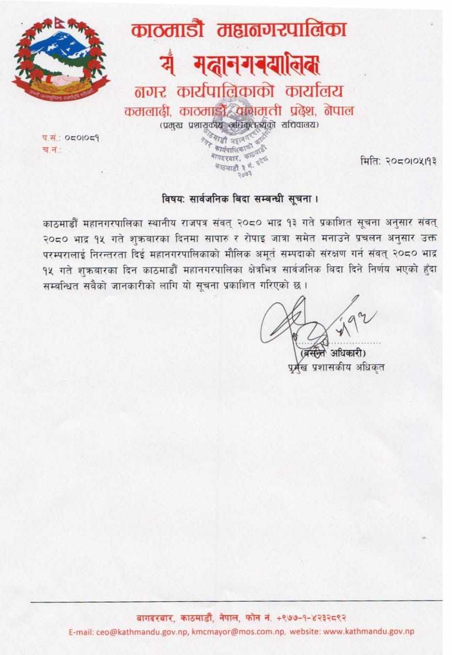भदौ १३, काठमाडौँ | काठमाडौं महानगरपालिकाले शुक्रबार सार्वजनिक बिदा दिएको छ।