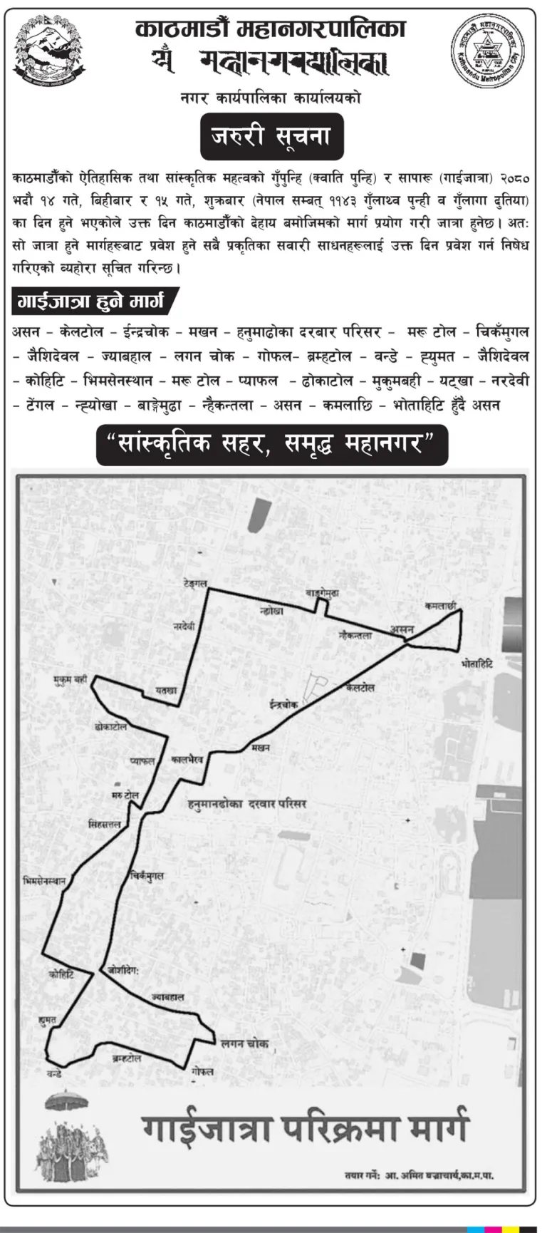 एक सूचना जारी गर्दै महानगरले बिहीबार गाईजात्रा र शुक्रबार गुँलागा दुतिया पर्व मनाउने भएकाले काठमाडौँका विभिन्न सडकमा सवारी साधन सञ्चालनमा रोक लगाइएको जनाएको हो ।