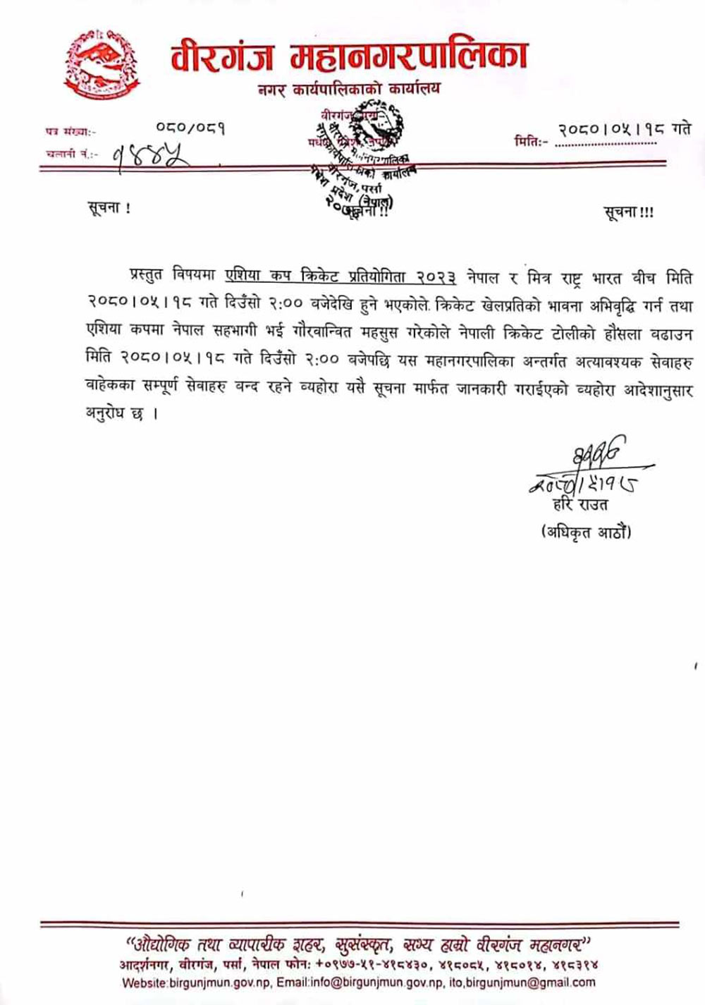 वीरगन्ज महानगरपालिका नगर कार्यपालिकाको कार्यालयले आज एसिया कप २०२३ अन्तर्गत भइरहेको नेपाल र भारतबीचको प्रतिस्पर्धा हेर्नका निमित्त वीरगन्ज महानगरपालिकाको अत्यावश्यकबाहेकका सम्पूर्ण सेवा दिउँसो २ बजेदेखि बन्द गर्ने जानकारी गराएको हो।
