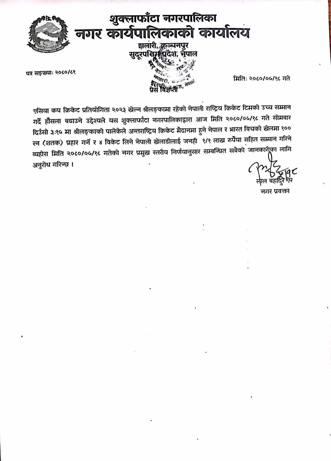 भारतविरुद्ध शतक प्रहार गर्ने र ४ विकेट लिने खेलाडीलाई जनही एक-एक लाखसहित सम्मान गर्ने शुक्लाफाँटा नगरपालिकाले निर्णय गरेको हो ।