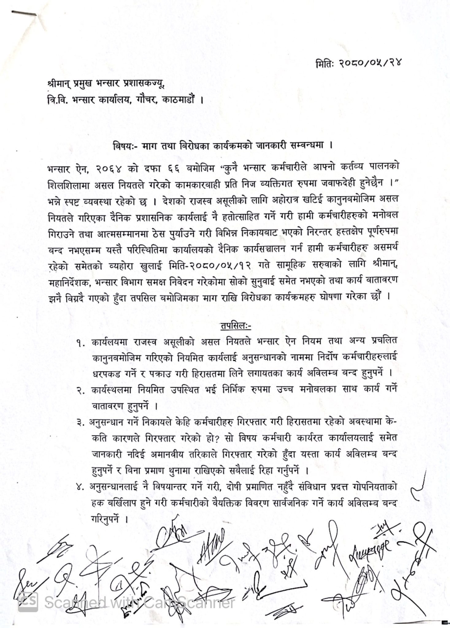 राजस्व असूलीको असल नियतले कानूनबमोजिम गरिएको नियमित कार्यलाई अनुसन्धानको बहानामा तथा अनुसन्धानलाई नै विषयान्तर गर्ने गरी निर्दोष कर्मचारीलाई धरपकड गरिएको भन्दै बन्द गर्नुपर्ने, कार्यालयमा भौतिक पूर्वाधार र आधुनिक प्रविधिको व्यवस्था गर्नुपर्ने, डरत्रास विना उच्च मनोबलमा काम गर्ने वातावरण हुनुपर्ने, विनाप्रमाण, पक्राउ पूर्जी अनुमति नलिई कर्मचारीहरुलाई गिरफ्तार गर्ने, दुःख दिने, हैरानी दिने कार्य बन्द गर्नुपर्नेलगायतका माग छन् ।