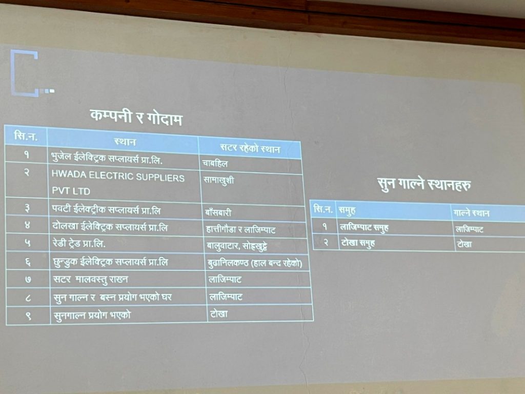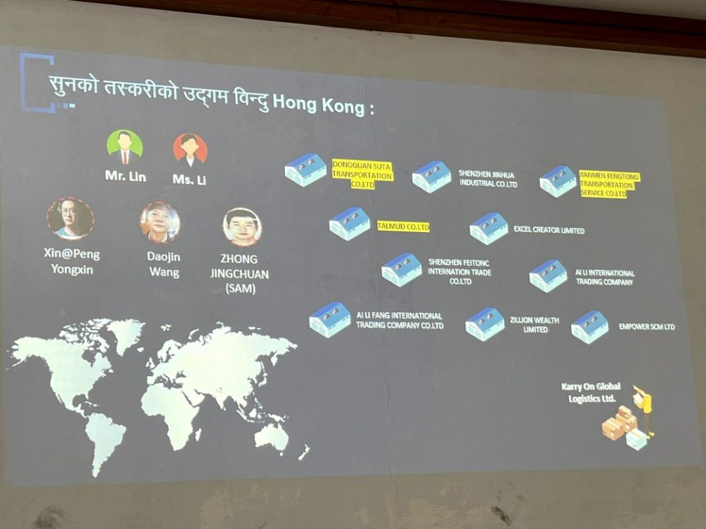 सीआईबीका एसपी संजयसिंह थापाले चिनियाँ गिरोहले नेपालमा ७ वटा कम्पनी खोलेर विद्युतीय सामानहरू आयात गर्ने गरेको जानकारी दिए । नेपालीहरूका नाममा कम्पनी खोलेर विद्युतीय सामग्री ल्याउने नाममा त्यसभित्र सुन राख्ने गरिएको उनले बताए ।