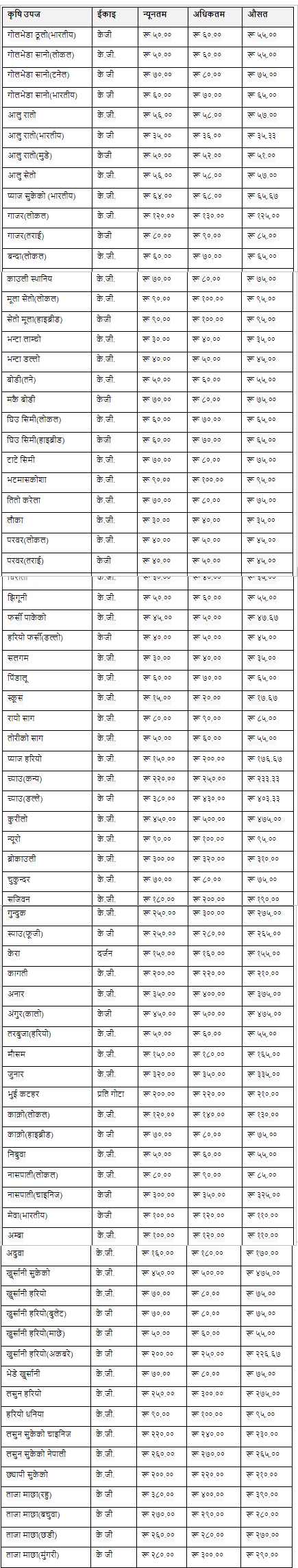 सेतो मुलाको मूल्य प्रतिकिलो ९५ रुपैयाँ, लाम्चो भन्टा ४५ रुपैयाँ र बोडी ५५ रुपैयाँ छ । यसबाहेक घिउ सिमी प्रतिकिलो ६५ रुपैयाँ, टाटे सिमी ७५ रुपैयाँ र तिते करेलाको थोक मूल्य प्रतिकिलो ७५ रुपैयाँ छ । यसबाहेक, परवर ४५ रुपैयाँ, घिरौँला ३५ रुपैयाँ, पाकेको फर्सीको मूल्य प्रतिकिलो ४७ रुपैयाँ रहेको जनाइएको छ ।