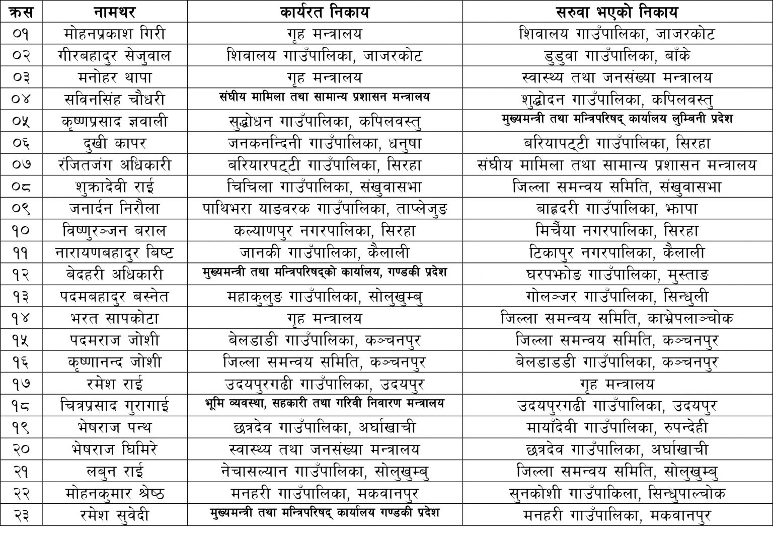 संघीय मामिला तथा सामान्य प्रशासन मन्त्रालयले संघ, प्रदेश तथा स्थानीय तहमा कार्यरत शाखा अधिकृत सरहका कर्मचारीको सरुवा गरेको हो ।