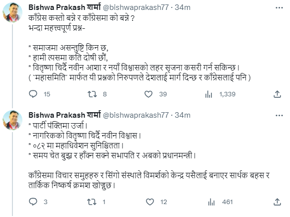 स्रोतका अनुसार आफू बैठकमा नआउने सन्देश शर्माले इतर समूहलाई दिइसकेका छन् । आज ट्विटरमा पनि उनले घुमाउरो संकेत गरेका छन् । तीनवटा ट्विट लेख्दै शर्माले आफ्नो धारणा प्रष्ट्याएका हुन् ।