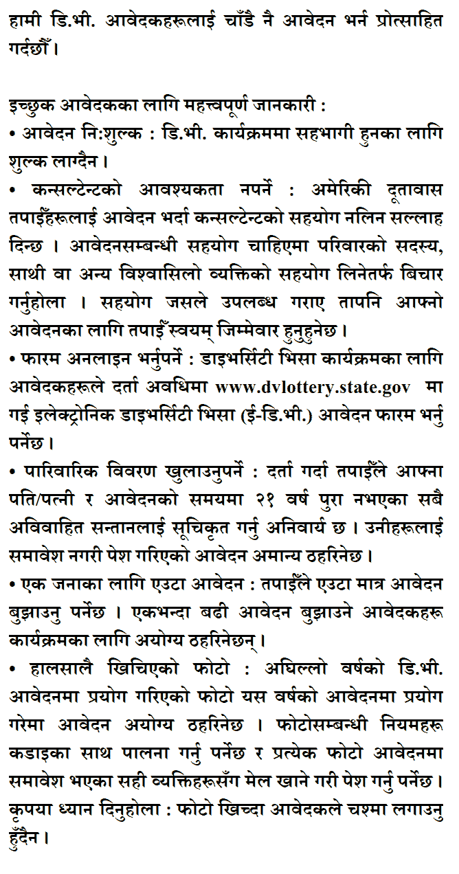 डि.भी. कार्यक्रमसम्बन्धी थप जानकारी https://dvprogram.state.gov/ वा काठमाडौँस्थित अमेरिकी दूतावासको वेबसाइट https://np.usembassy.gov/visas/ मा उपलब्ध छ ।