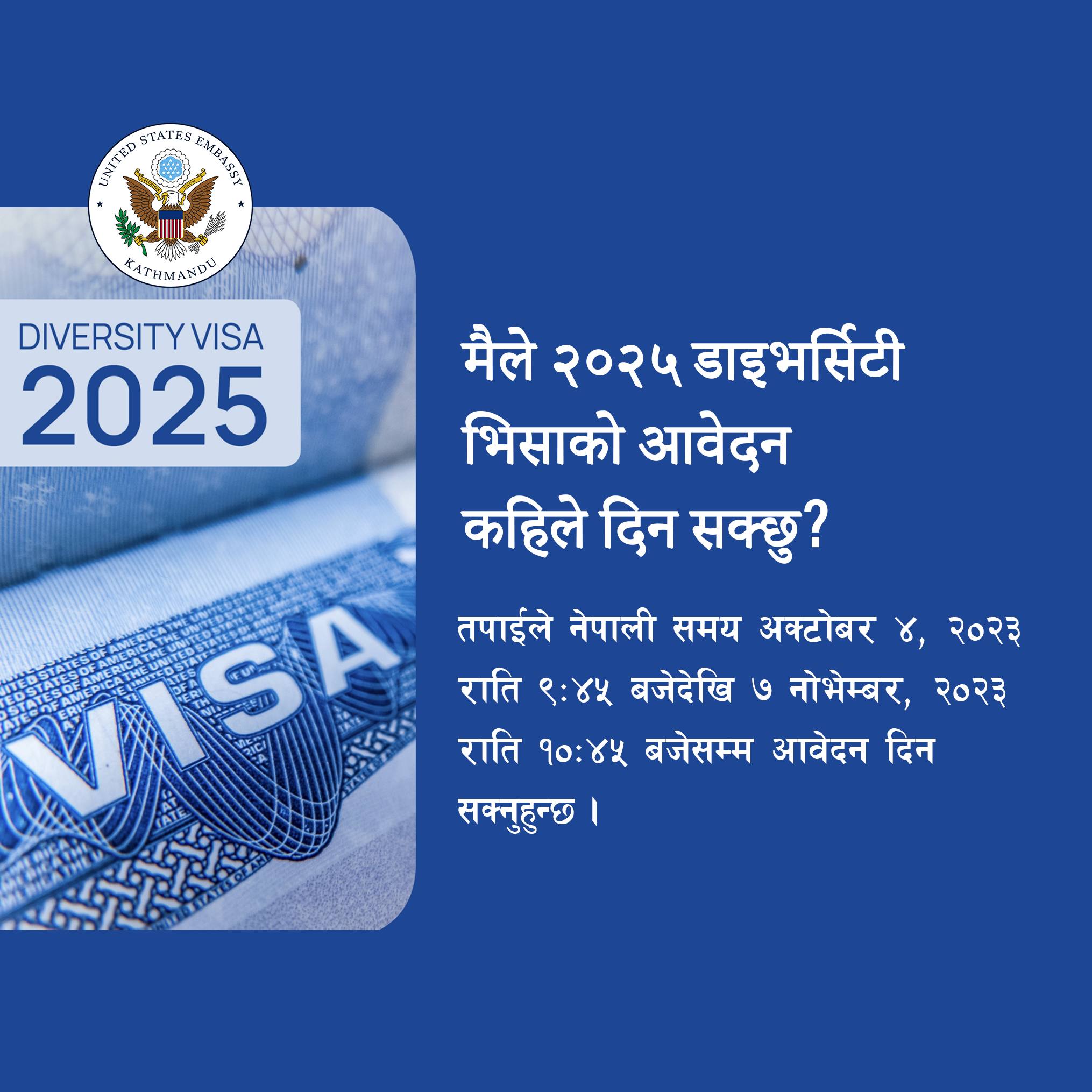 असोज १८, काठमाडौँ | सन् २०२५ को डाइभर्सिटी भिसा (डि.भी.) को लागि आवेदन खुला गरिएको छ। इस्टर्न स्ट्यान्डर्ड टाइमको मध्याह्न अर्थात् नेपाली समयअनुसार बुधबार राति ९ः४५ बजेबाट आवेदन खुला गरिएकाे छ। डिभीको आवेदन नोभेम्बर ७ अर्थात् कार्तिक २१ गतेसम्म भर्न सकिने छ।