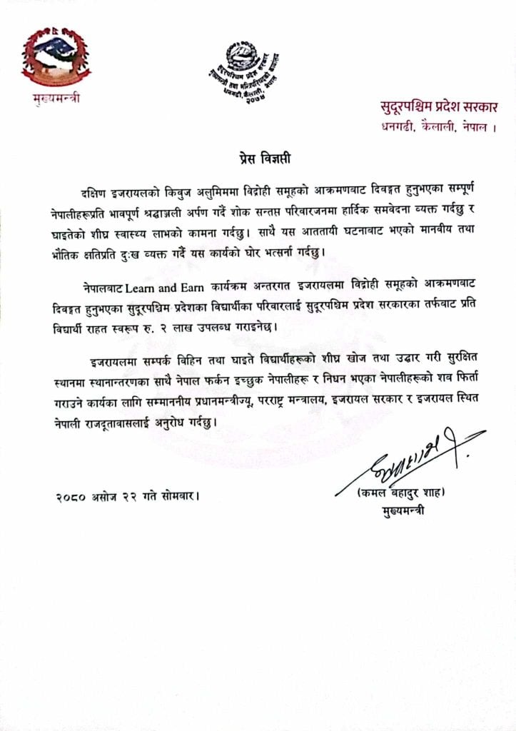 मुख्यमन्त्री कमल शाहले हस्ताक्षर गरेको विज्ञप्तिमा इजरायलबाट शव ल्याउन सहजीकरण गरिदिन संघीय सरकारलाई अनुरोधसमेत गरेको छ।
