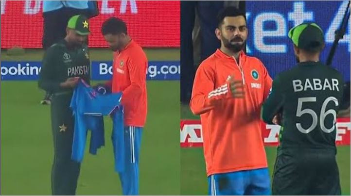 भारतविरुद्ध हिजो भएको समूह चरणको खेलमा पाकिस्तानले शर्मनाक हार व्यहोर्यो । बाबरले अर्धशतक बनाए पनि म्याच विनिङ पारी खेल्न सकेनन् । पाकिस्तानले दिएको १९१ रनको झिनो लक्ष्य भारतले ७ विकेट बाँकी हुँदै पूरा गरेको थियो ।हारको चोटले रन्थनिइरहेका पाकिस्तानी समर्थकहरु बाबरको एउटा गेस्चरले थप मर्माहत बनेका छन् । खेल सकिएपछि बाबर र विराटको एउटा फुटेज बाहिर आएको छ, जसमा बाबरले विराटको हातबाट भारतको जर्सी लिइरहेको देखिन्छ । भारतीय मिडियाले बाबरले विराटको अटोग्राफसहितको जर्सी उपहार मागेको भनेर प्रचार गरिरहेका छन् ।