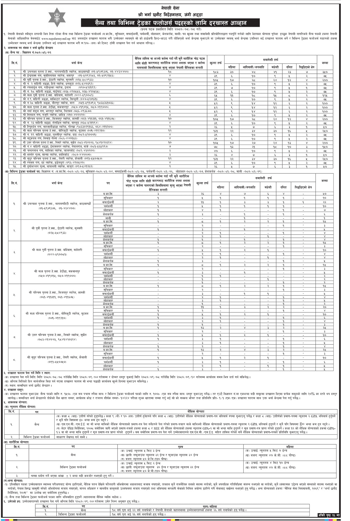 मङ्सिर ८, काठमाडौँ | नेपाली सेनाले रिक्त पदपूर्तिका लागि आवेदन माग गरेको छ । सेनाको भर्ना छनोट निर्देशनालय जंगी अड्डाले शुक्रबार एक सूचना जारी गर्दै सैन्य तथा विभिन्न ट्रेडका फलोअर्स पदहरूका लागि दरखास्त आह्वान गरेको हो ।