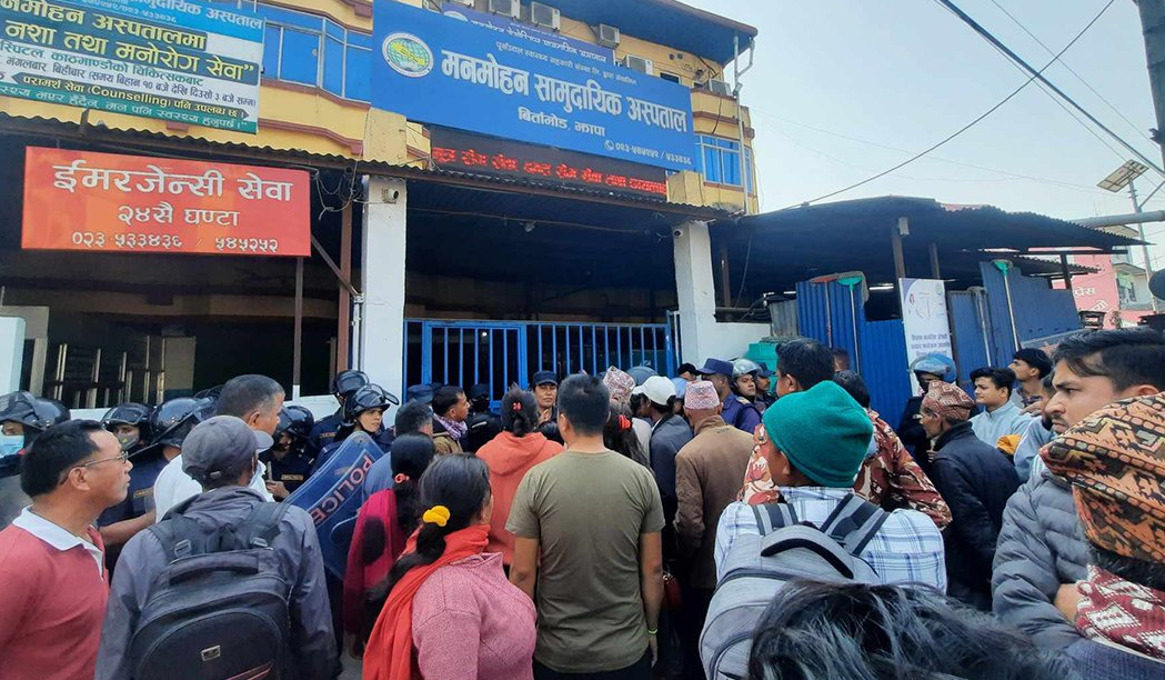 पुस १०, काठमाडौँ | झापाको बिर्तामोडस्थित मनमोहन मेमोरियल सामुदायिक अस्पताल परिसर तनावग्रस्त बनेको छ । उपचाररत एक महिला बिरामीको मृत्यु भएपछि बिरामी पक्षका आफन्तहरूले सोमबार साँझदेखि नै अस्पताल परिसर घेराउ गर्दै नाराबाजी गरिरहेका छन् ।