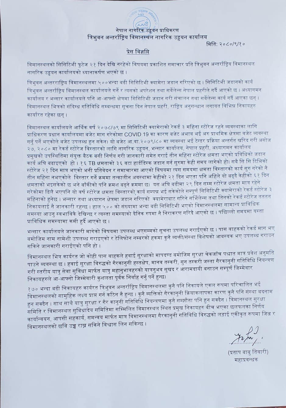 यद्यपी असोज २७, २०८० बाट भने विमानस्थलका विभिन्न क्षेत्रमा गरी जडित ५०० वटा सीसीटिभीको स्टोरेज तीन महिना बनाउन लागिएको र यसै वर्षभित्र त्यो सम्पन्न हुने महाप्रबन्धक तिवारीले उनले उल्लेख गरेका छन् ।