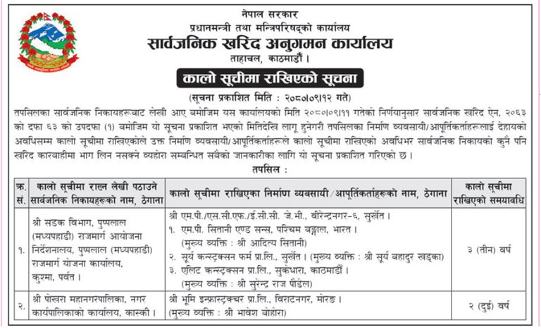 पुस १२, काठमाडौं | सार्वजनिक खरिद अनुगमन कार्यालयले मध्यपहाडी राजमार्गमा काम गर्ने चारवटा कम्पनीलाई कालोसूचीमा राखेको छ । कार्यालयले समयममै नियमानुसार काम नगर्ने चारवटा कम्पनी एमपी/एससीएफ/ईसीसी जेभी सुर्खेत र भूमि इन्फ्रा स्ट्रक्चर प्रालि मोरङलाई दुईदेखि तीन वर्षका लागि कालोसूचीमा राखेको हो ।