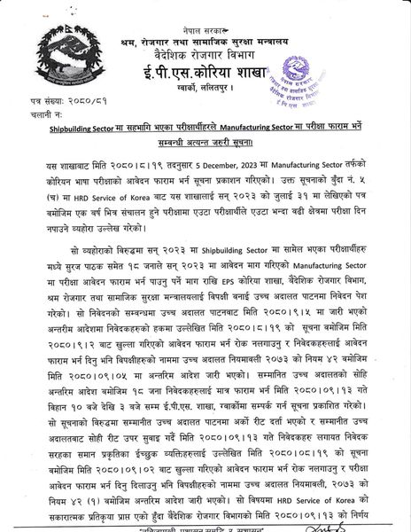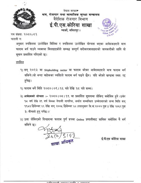 यसअघि ईपीएस कोरिया शाखाले मंसिर १९ गते सूचना प्रकाशित गरेर कोरियाको उत्पादनमूलक क्षेत्रको रोजगारीका लागि दरखास्त आह्वान गरेको थियो । तर, त्यसमा जहाज निर्माण कम्पनीतर्फ परीक्षा दिएकाहरुले सहभागी हुन नपाउने विभागले बताएको थियो ।